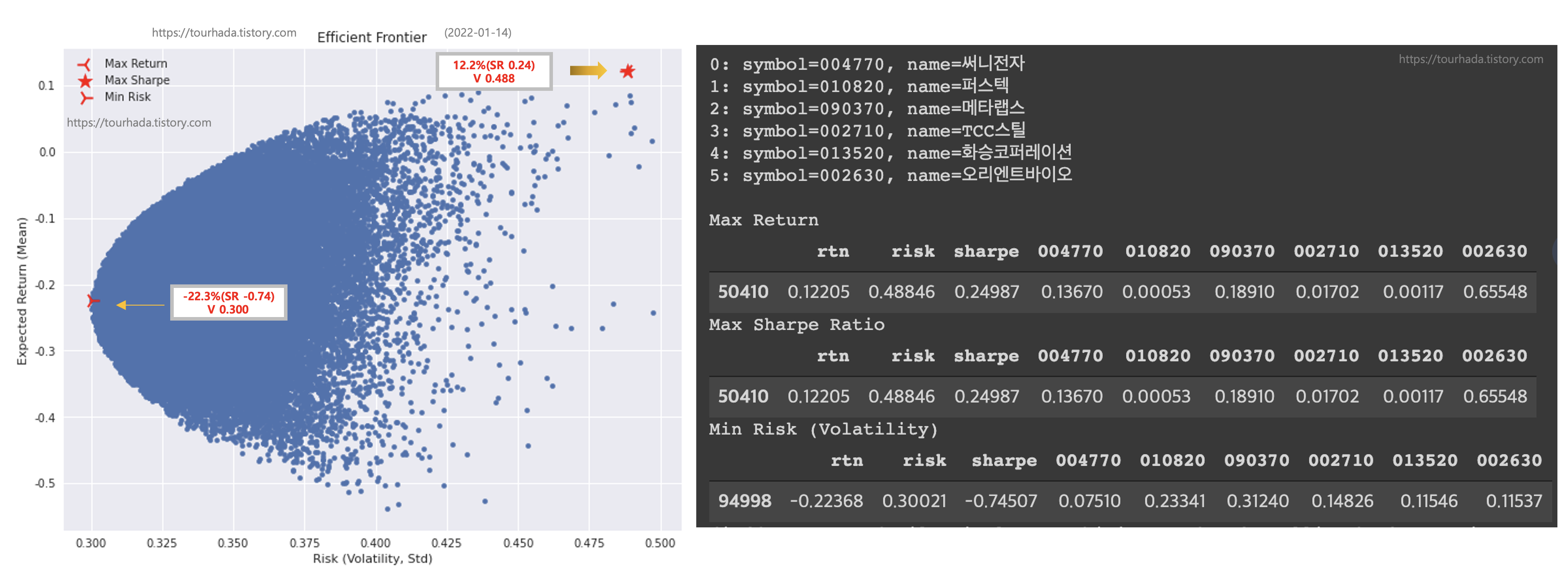 최고 위험 수익률은 12.2%로 샤프비율(0.249)로서 리스크 프리미엄 대비 최적 수익률과 같게 나왔다. 여기서 리스크 변동성(volatility)는 0.488로 나왔다. 안전 추구형 성향에서 랜덤 포트폴리오는 -22.3% 수익률이 나오고, 이때 샤프비율은 -0.74 , 리스크 변동성은 0.300으로 나왔다.