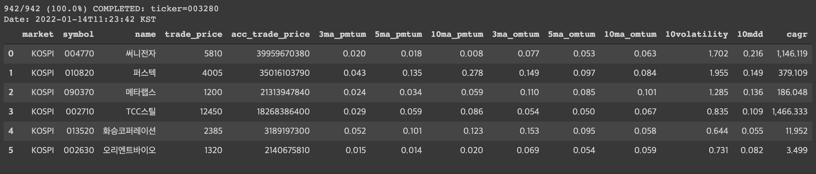앞서 차트 분석을 통한 변동성과 모멘텀 전략으로 그래프가 우상향 하는 종목들만 랭킹을 뽑아서 거래대금과 연간환산수익률(CAGR) 이 높은 기준들로 분석했다. 실시간 거래 정보들은 주식은 KRX에 등록된 KOSPI 942개(2022년 1월 11일 기준)와 KOSDAQ 1535개(2021년 1월 11일기준), 코인은 업비트(upbit)에 상장된 110개(2022년 1월 11일 기준 위믹스(WEMIX) 신규상장 )중에서 분석 기준시점에 추천 목록을 자동으로 데이터 모델링을 해보았다.