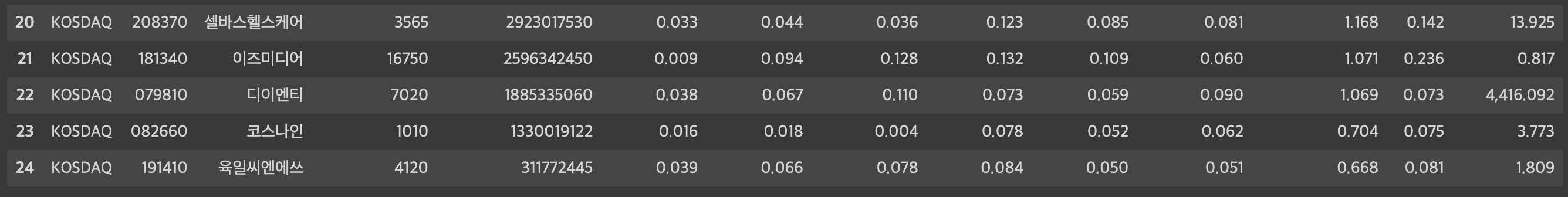 | KOSDAQ | 041590 | 젬백스지오 | 1435 | 28021553945 | 0.005 | 0.068 | 0.127 | 0.120 | 0.098 | 0.067 | 0.716 | 0.021 | 436.015 |