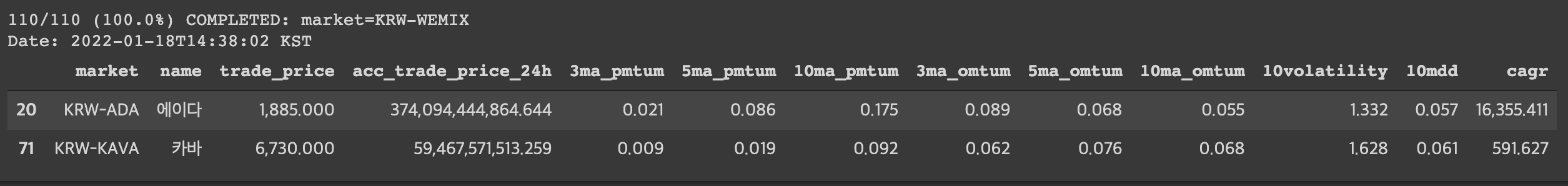 110/110 (100.0%) COMPLETED: market=KRW-WEMIX