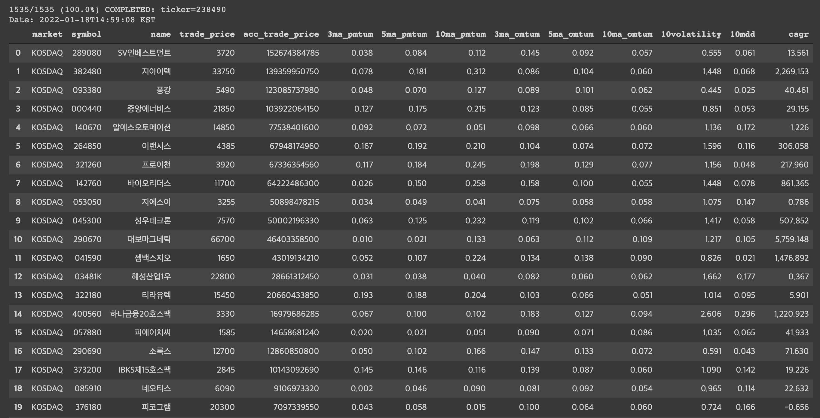 앞서 차트 분석을 통한 변동성과 모멘텀 전략으로 그래프가 우상향 하는 종목들만 랭킹을 뽑아서 거래대금과 연간환산수익률(CAGR) 이 높은 기준들로 분석했다.  실시간 거래 정보들은 주식은 KRX에 등록된 KOSPI 942개(2022년 1월 11일 기준)와  KOSDAQ 1535개(2021년 1월 11일기준),  코인은 업비트(upbit)에 상장된 110개(2022년 1월 11일 기준 위믹스(WEMIX) 신규상장 )중에서 분석 기준시점에 추천 목록을 자동으로 데이터 모델링을 해보았다.