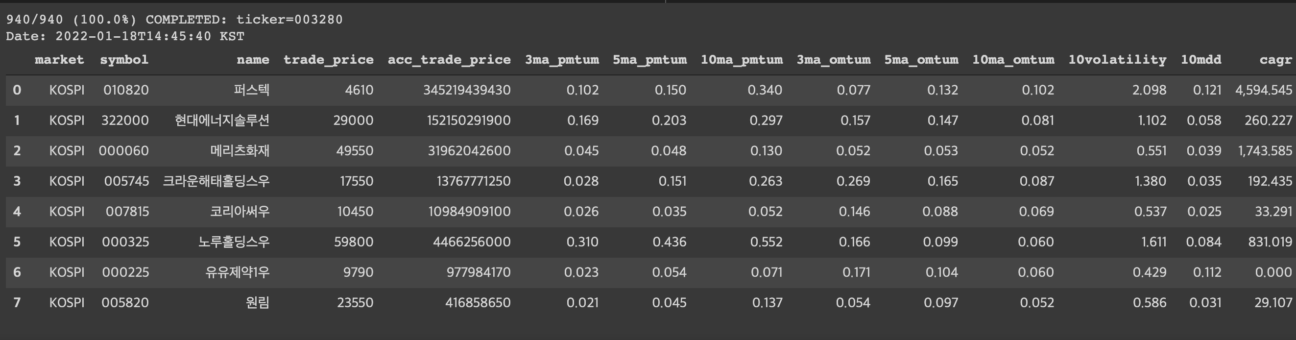 앞서 차트 분석을 통한 변동성과 모멘텀 전략으로 그래프가 우상향 하는 종목들만 랭킹을 뽑아서 거래대금과 연간환산수익률(CAGR) 이 높은 기준들로 분석했다. 실시간 거래 정보들은 주식은 KRX에 등록된 KOSPI 942개(2022년 1월 11일 기준)와 KOSDAQ 1535개(2021년 1월 11일기준), 코인은 업비트(upbit)에 상장된 110개(2022년 1월 11일 기준 위믹스(WEMIX) 신규상장 )중에서 분석 기준시점에 추천 목록을 자동으로 데이터 모델링을 해보았다.