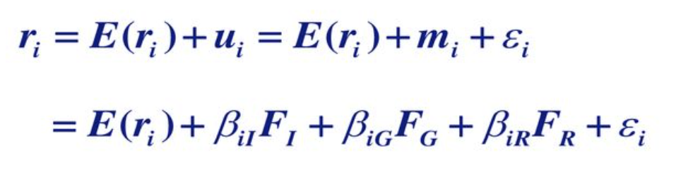 예) 체계적 위험의 공통요소로 세개의 공통요인 - 인플레이션(I), 국민총생산(G), 이자율(R) - 있다고 가정하면, 시장에서 거래하는 모든 주식은 세 요인에 대한 베타계수를 가질 것이며 아래와 같은 식으로 분해됨