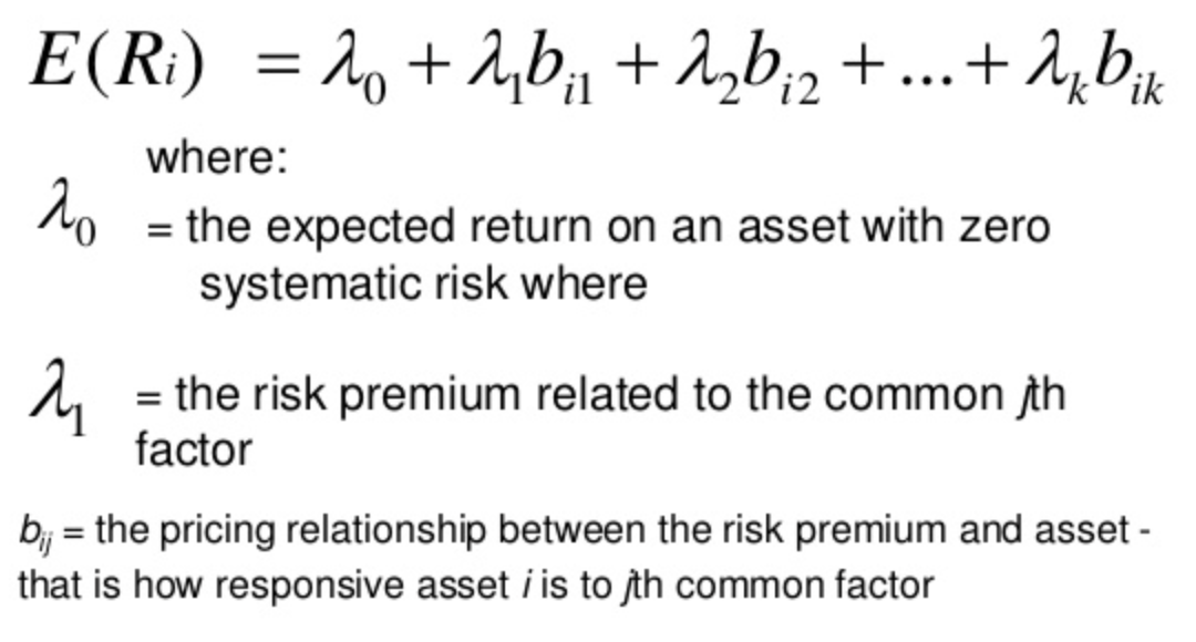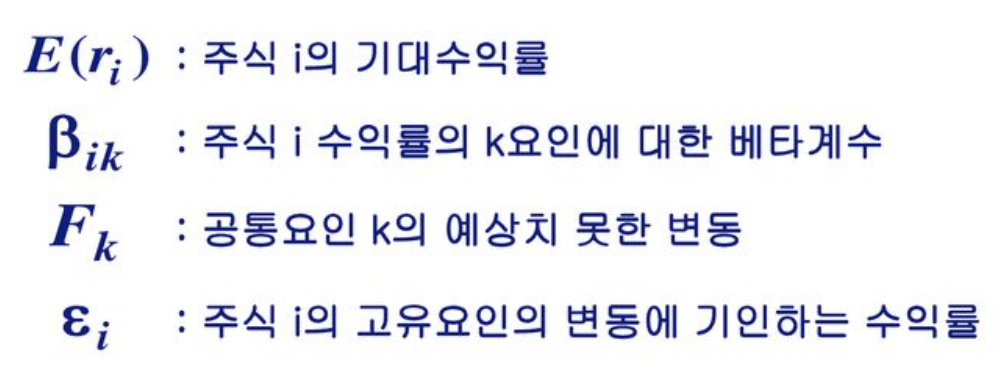 이러한 APT는 증권수익률이 시장포트폴리오수익률이라는 단일요인과 선형관계를 가진다는 CAPM에 비해 아래식과 같이 $k$개의 공통요인에 의해 생성된다고 가정하고 있어 CAPM보다 더 일반성을 갖습니다.