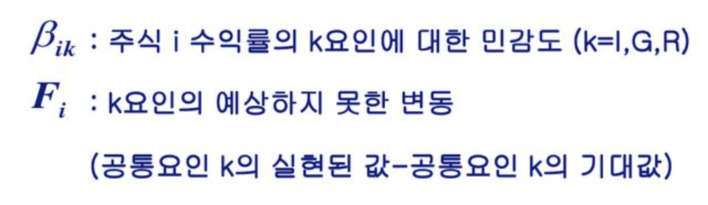 예) 체계적 위험의 공통요소로 세개의 공통요인 - 인플레이션(I), 국민총생산(G), 이자율(R) - 있다고 가정하면, 시장에서 거래하는 모든 주식은 세 요인에 대한 베타계수를 가질 것이며 아래와 같은 식으로 분해됨