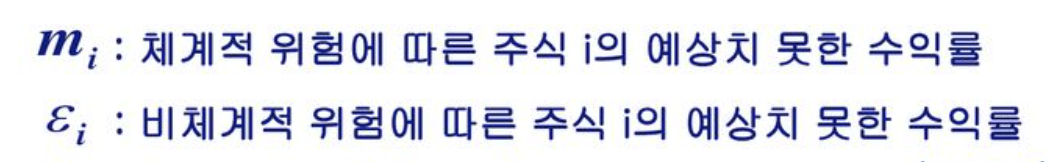 - 주식 $i$에만 영향을 주는 고유요인(비체계적위험)에 기인하는 부분