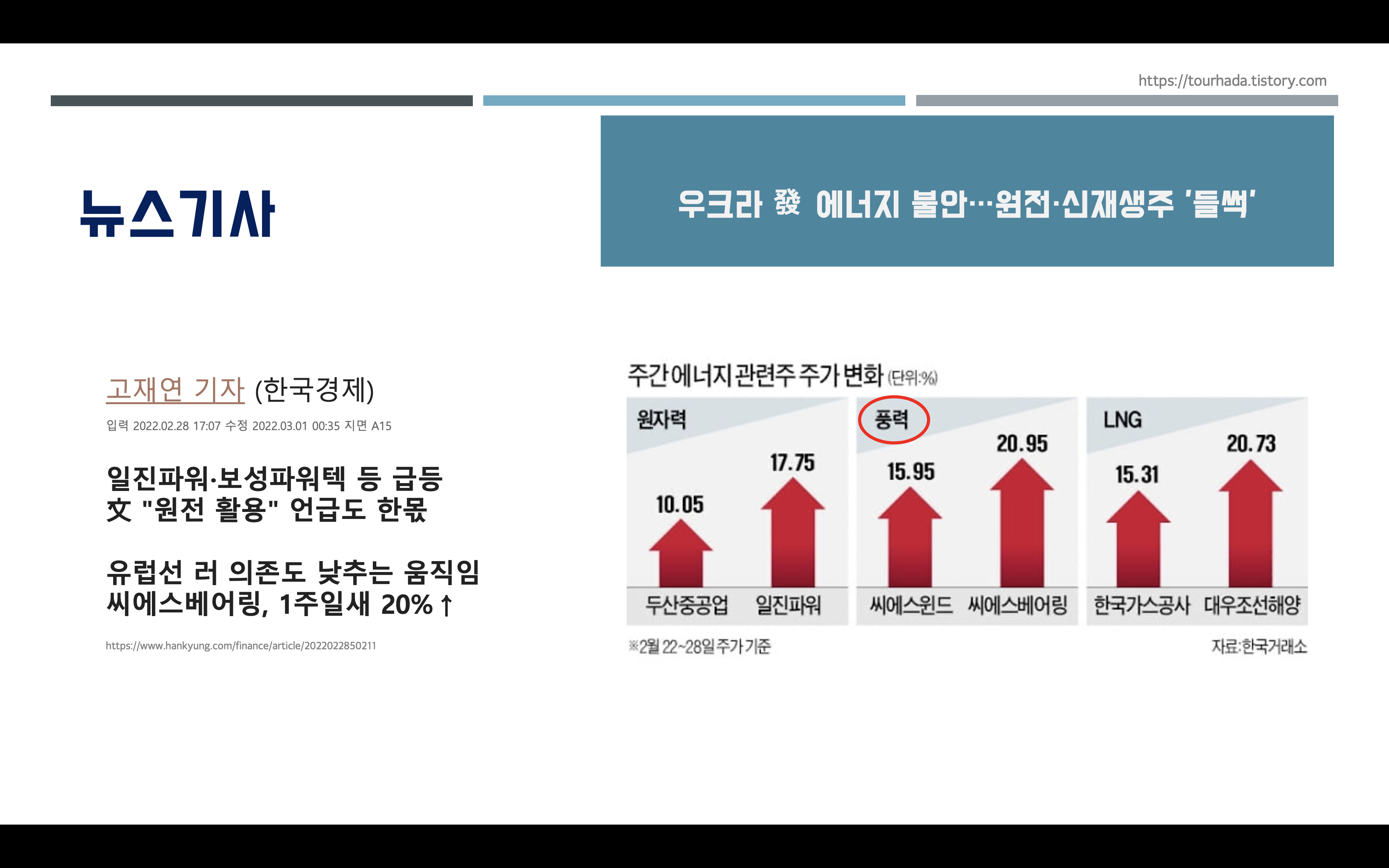 최근 뉴스기사는 러시아가 우크라이나 침공 사태로 인한 에너지 수급에 불안에 따른 대체에너지 관련 수혜를 받은 주간 에너지관련주 주가변화로 원자력과 풍력, LNG 관련 산업이 15%부터 많게는 30% 주가가 변화했다는 뉴스 기사 보도가 있었습니다.(한국경제 2022.03.01)