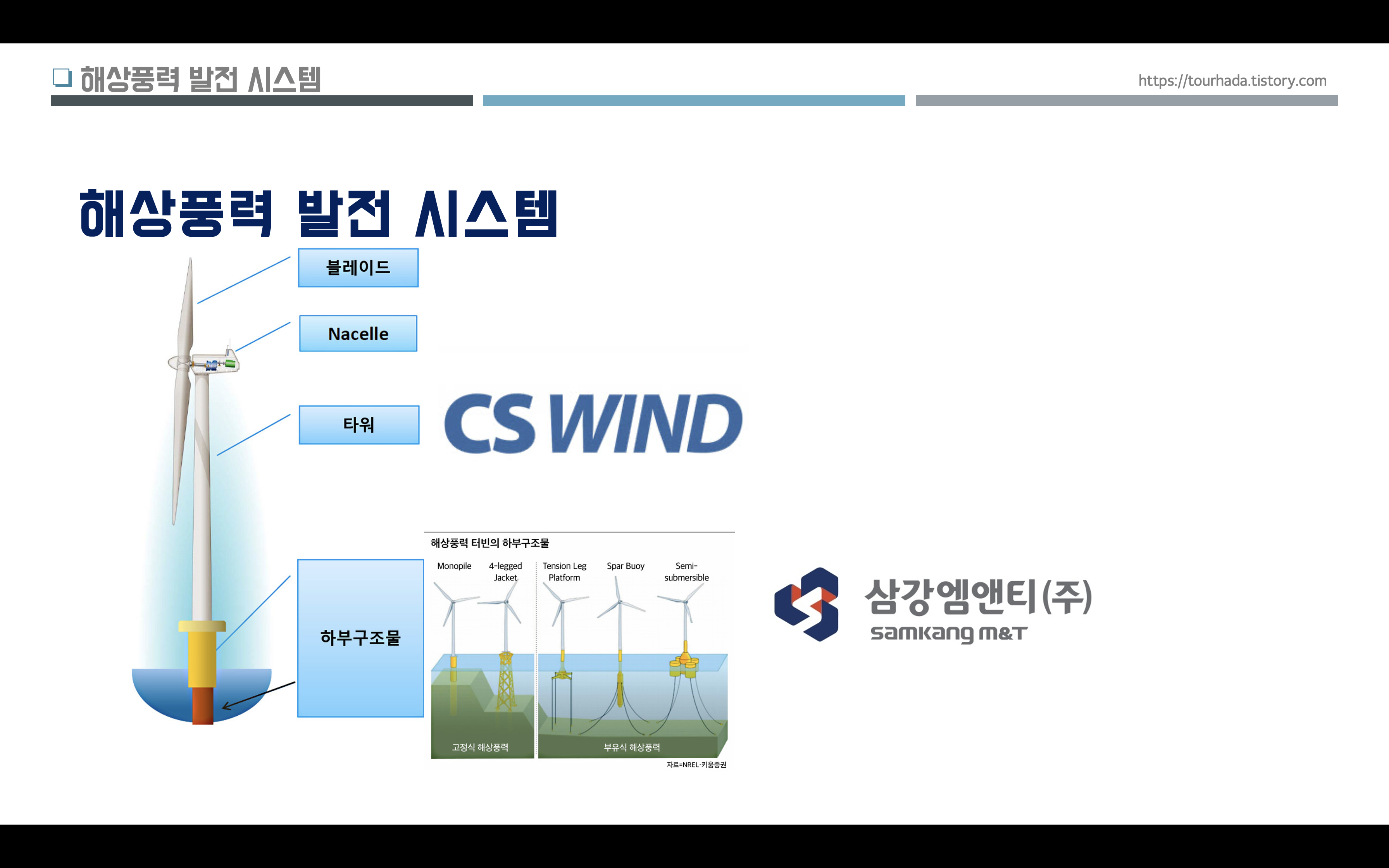 이와 관련해서 이번에 상층부 구조물인 윈트 타워 제작 업체인 씨에스윈드(112610) 중심으로 기업 분석자료를 살펴보고, 하부구조물 관련업체인 삼강엠앤티와 비교 분석한 결과를 설명하겠습니다.