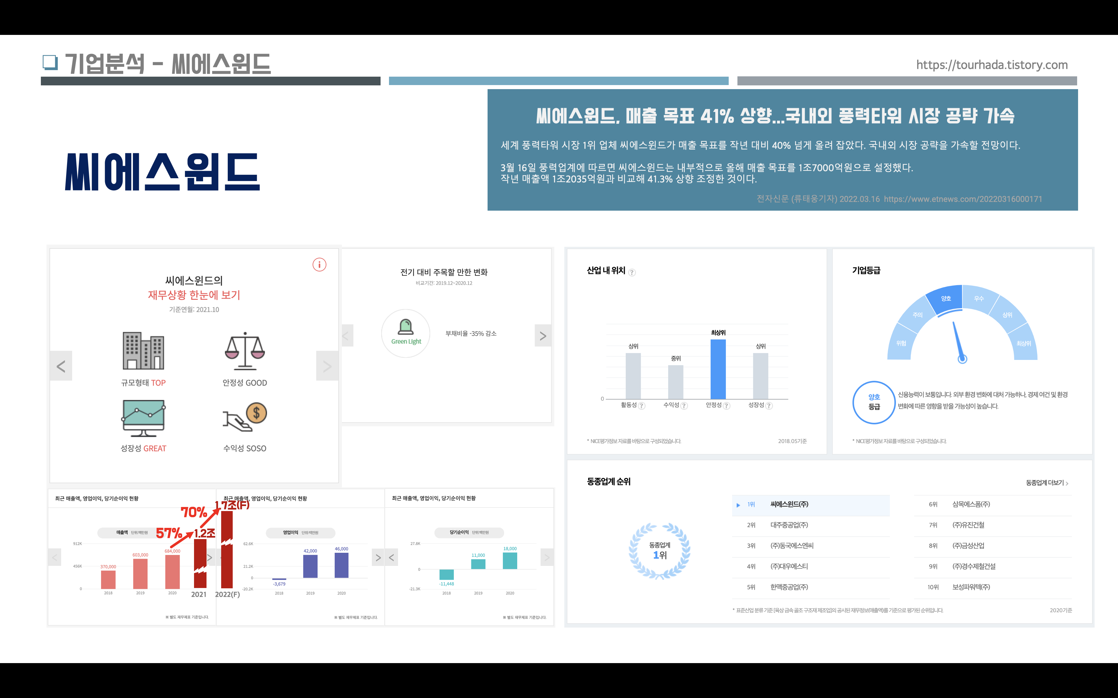 기업분석은 씨에스윈드(112610) 부터 살펴보도록 하겠습니다. 씨에스윈드는 동종업계대비 최상위층에 해당하고, 세계 1위 풍력타워 제조업체 라는 타이틀이 있습니다. 주요고객사는 베스타스, 지멘스 가메사, GE 등 글로벌 터빈 3사 로서 글로벌 굵직한 기업들과 수주계약을 꾸준히 해오고 있습니다. 올해는 러시아 - 우크라이나 사태로 인해 터키, 포르투갈, 베트남 공장에서 유럽향 풍력타워 공급계약이 이루어질 전망이라고 합니다. 경쟁 상대인 중국 타워업체들이 반덤핑 판정을 받은 상태라서 유럽시장 확대는 씨에스윈드에게 혜택이 클 것이라는 전망입니다. 최근 세계각국의 리쇼어링 정책으로 인하여 철강 및 부품 소재 가격이 급등한 것을 감안해서, 제품 소재 단가의 70%가 소비자에게 부담하는 방식이라 에너지 관련 풍력발전 산업에 있어서  경쟁력을 약화시키는 요인으로 보고 있습니다.