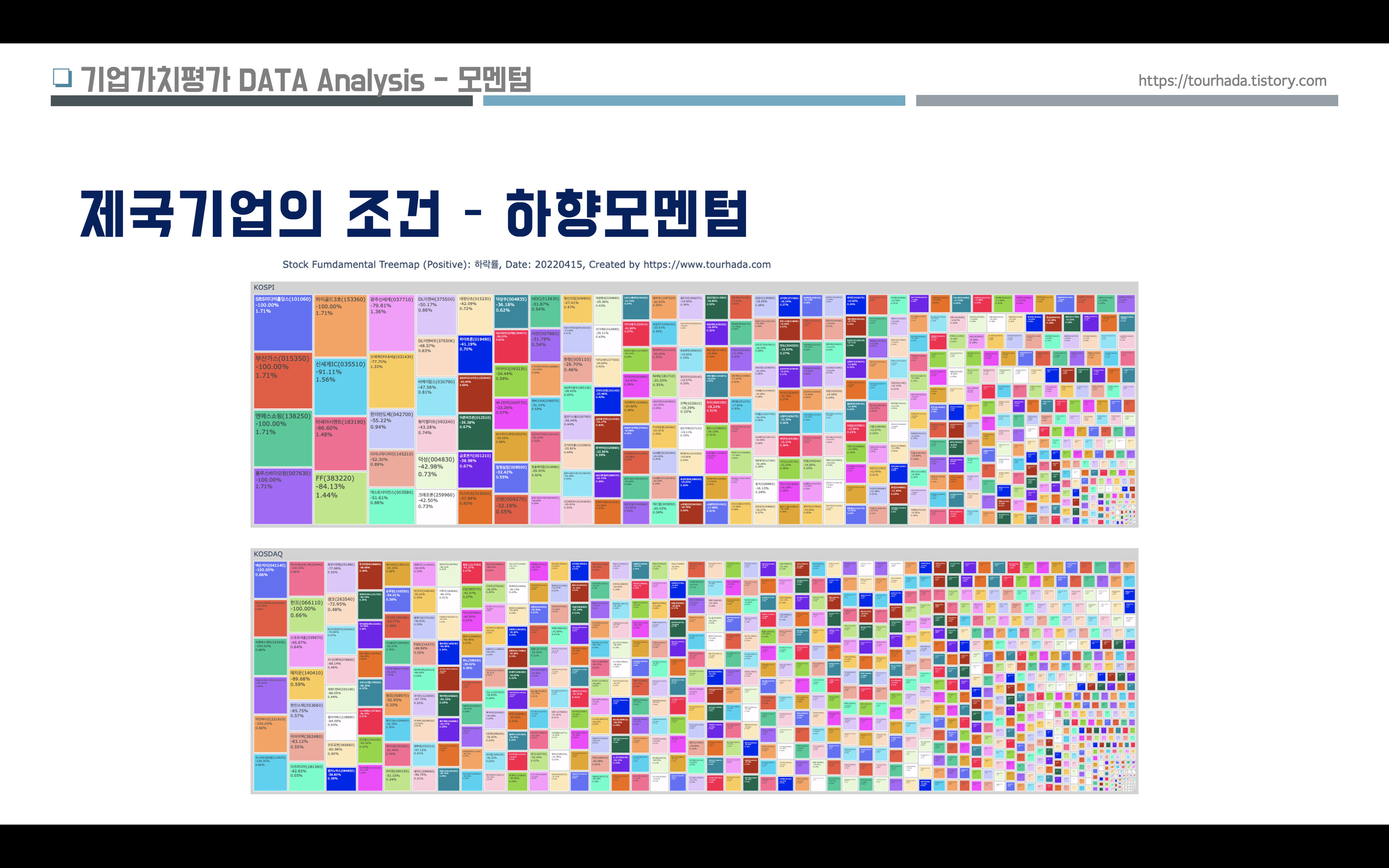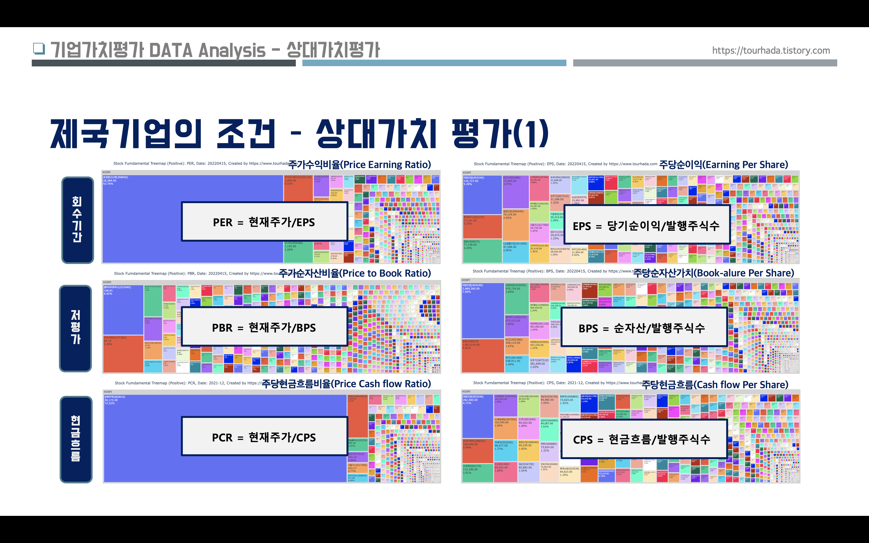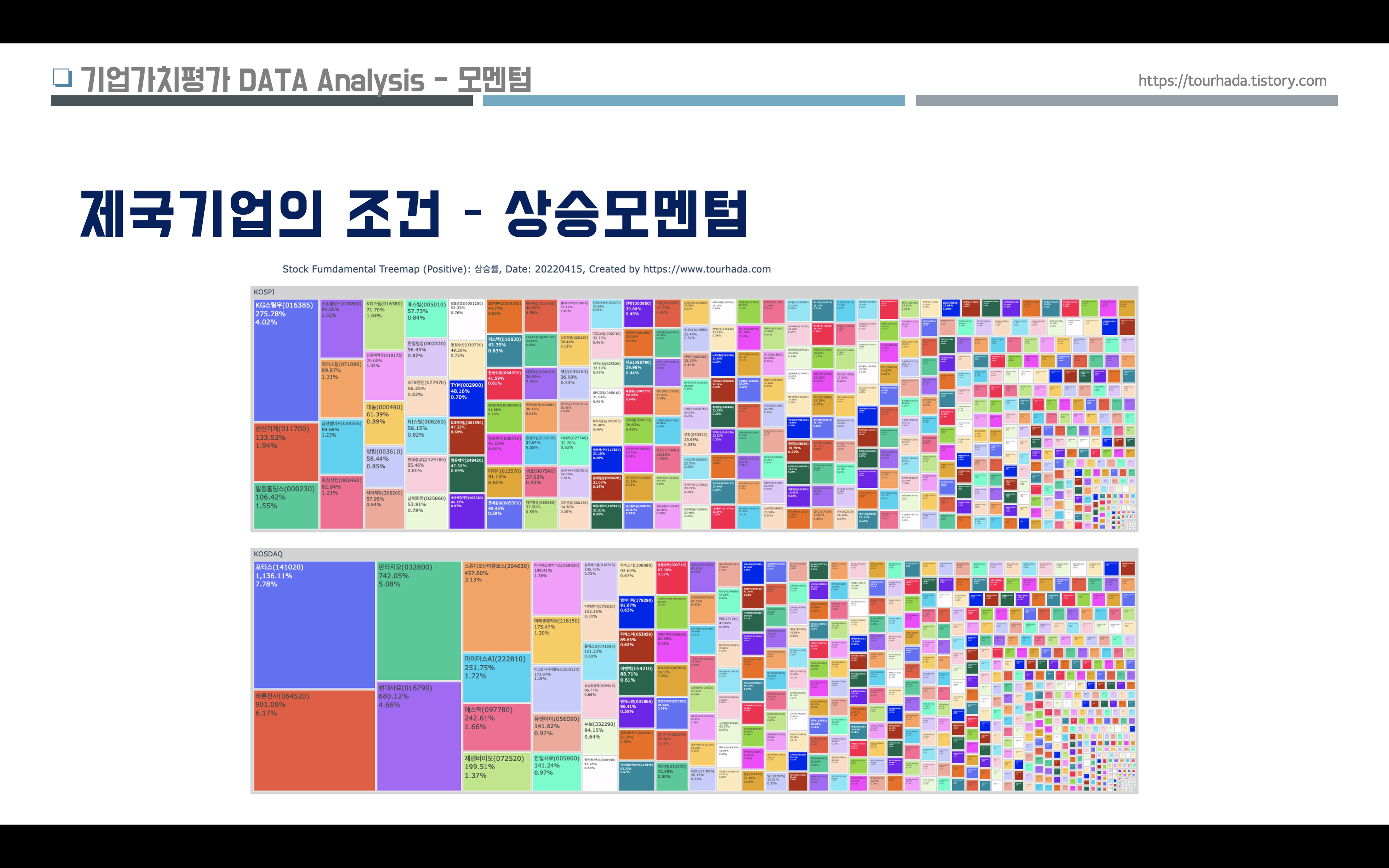 제국 기업의 조건으로 여러가지 지표들이 있겠지만, 이번에는 크게 세가지 상대가치평가, 상승모멘텀, 시가총액 지표들 중에서 거래소에 상장된 주식들의 서열을 데이터 시각화된 이미지로 분석해 보았다.