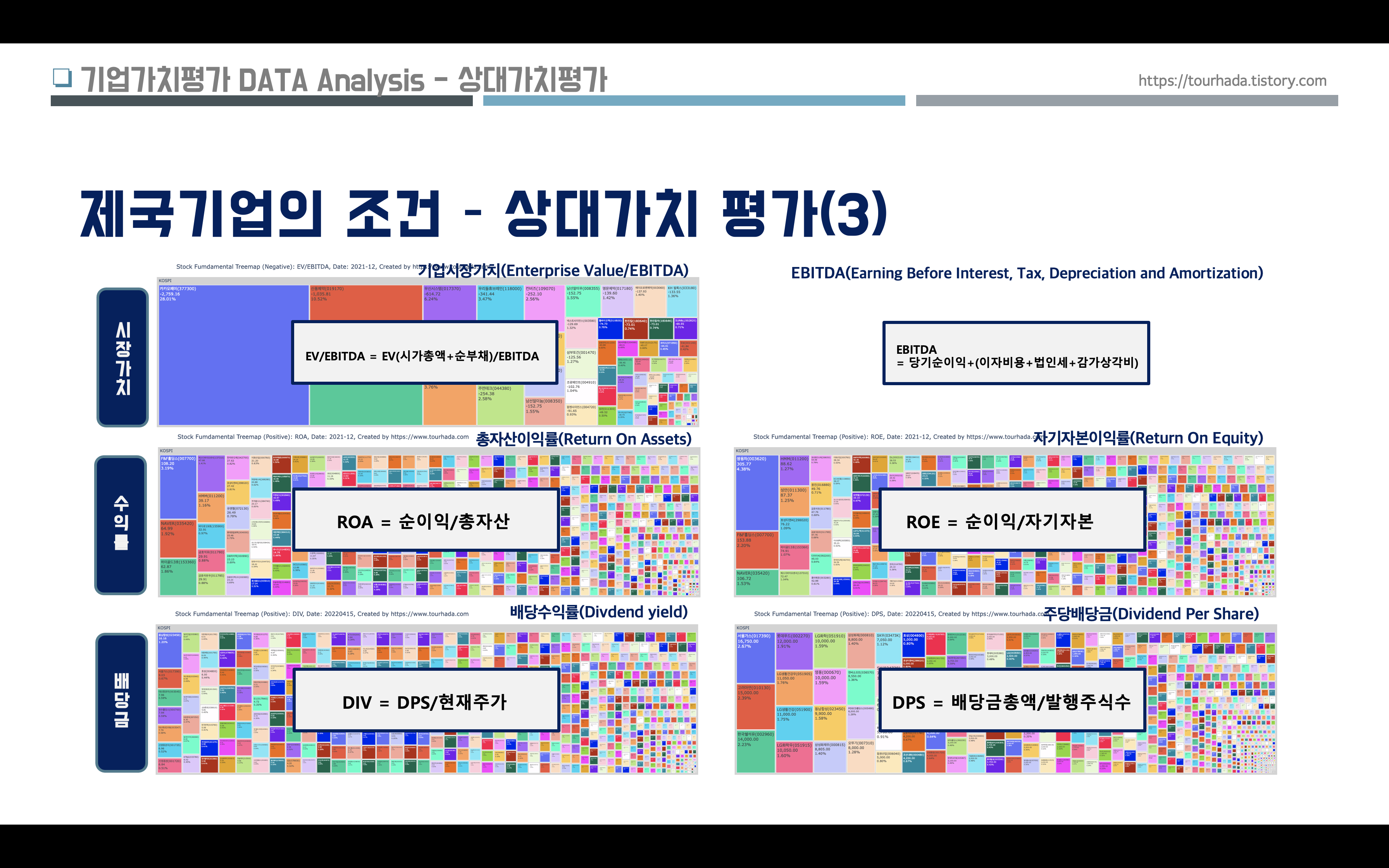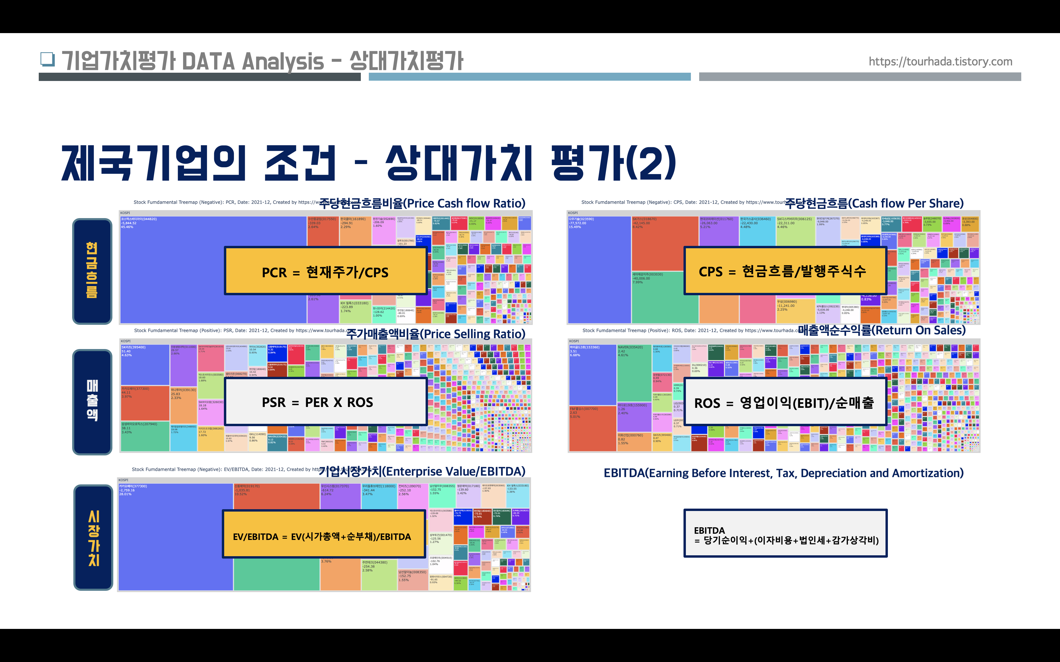 - 비교기준: EV/EBITDA 값이 낮으면 주가가 기업가치에 비해 저평가 높으면 고평가