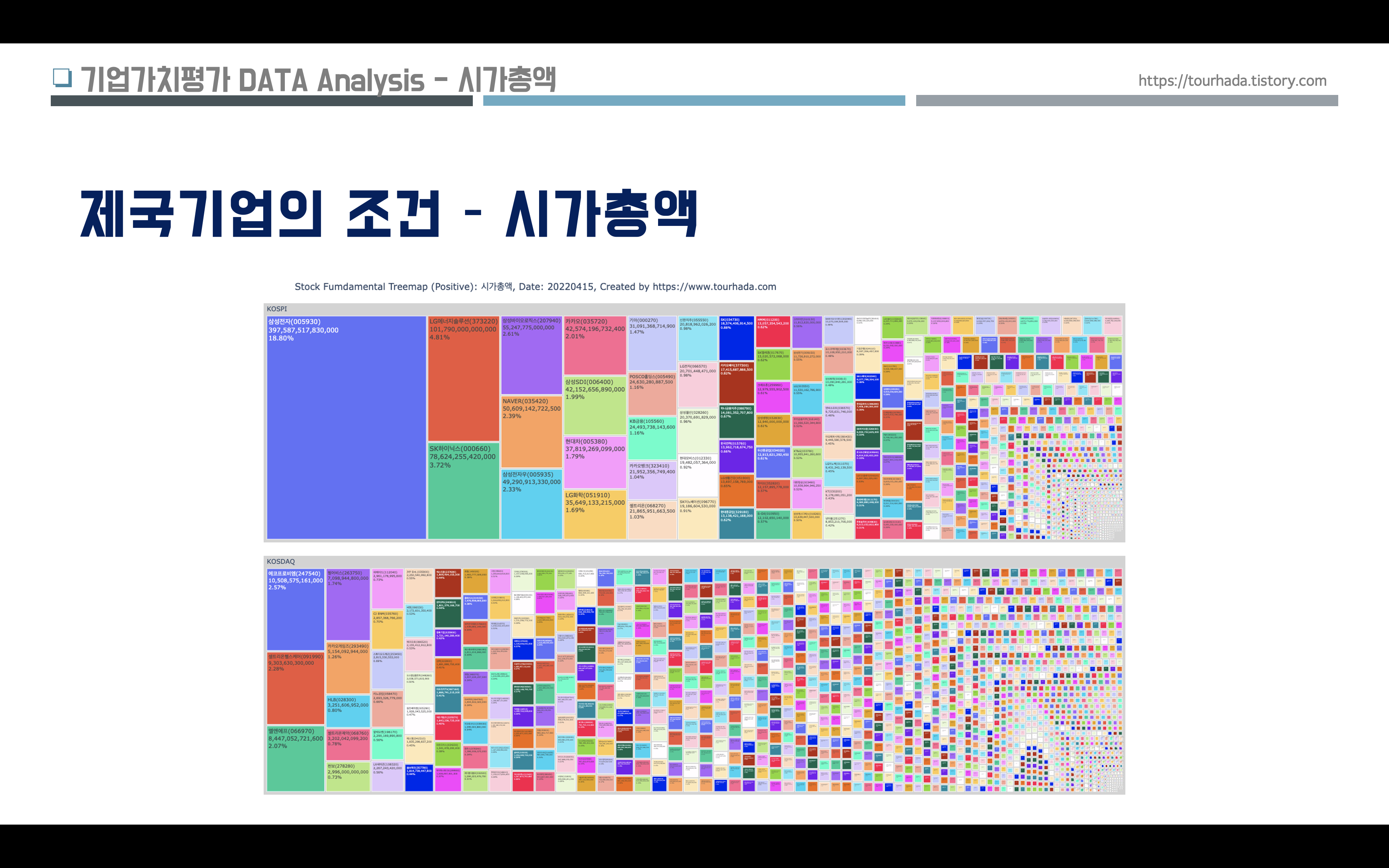 시가총액 데이터 분석은 코스피(KOSPI)와 코스닥(KOSDAQ) 두개로 나누었고, 2022년 4월 15일 기준으로 확인했다.