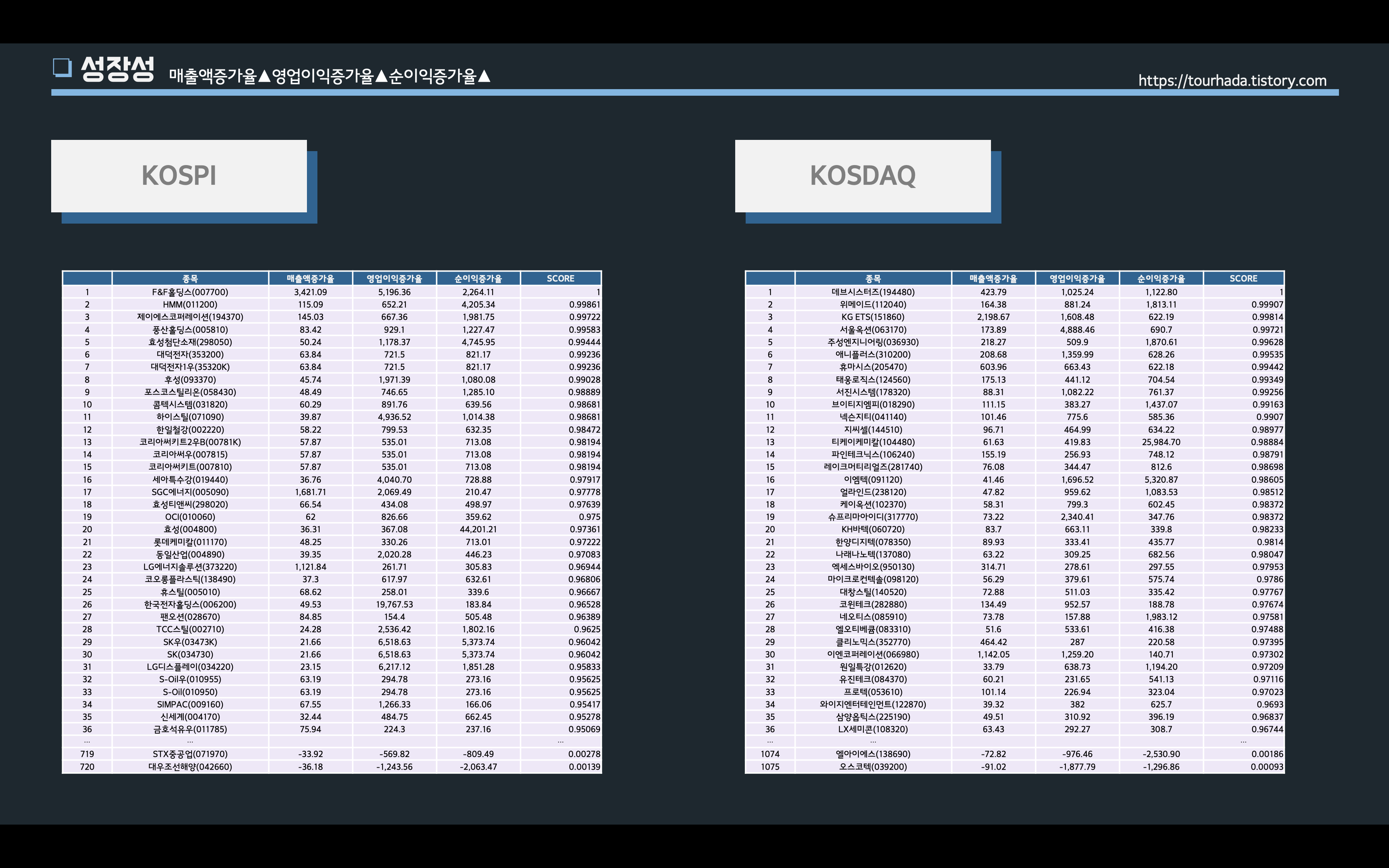 이와 관련된, 지표들 중에 매출액증가율, 영업이익증가율, 순이익증가률 세가지를 데이터 모델링으로 최고값과 최소값의 평균가중치로 백분위로 나눠서 서열을 재정리 해보았다.