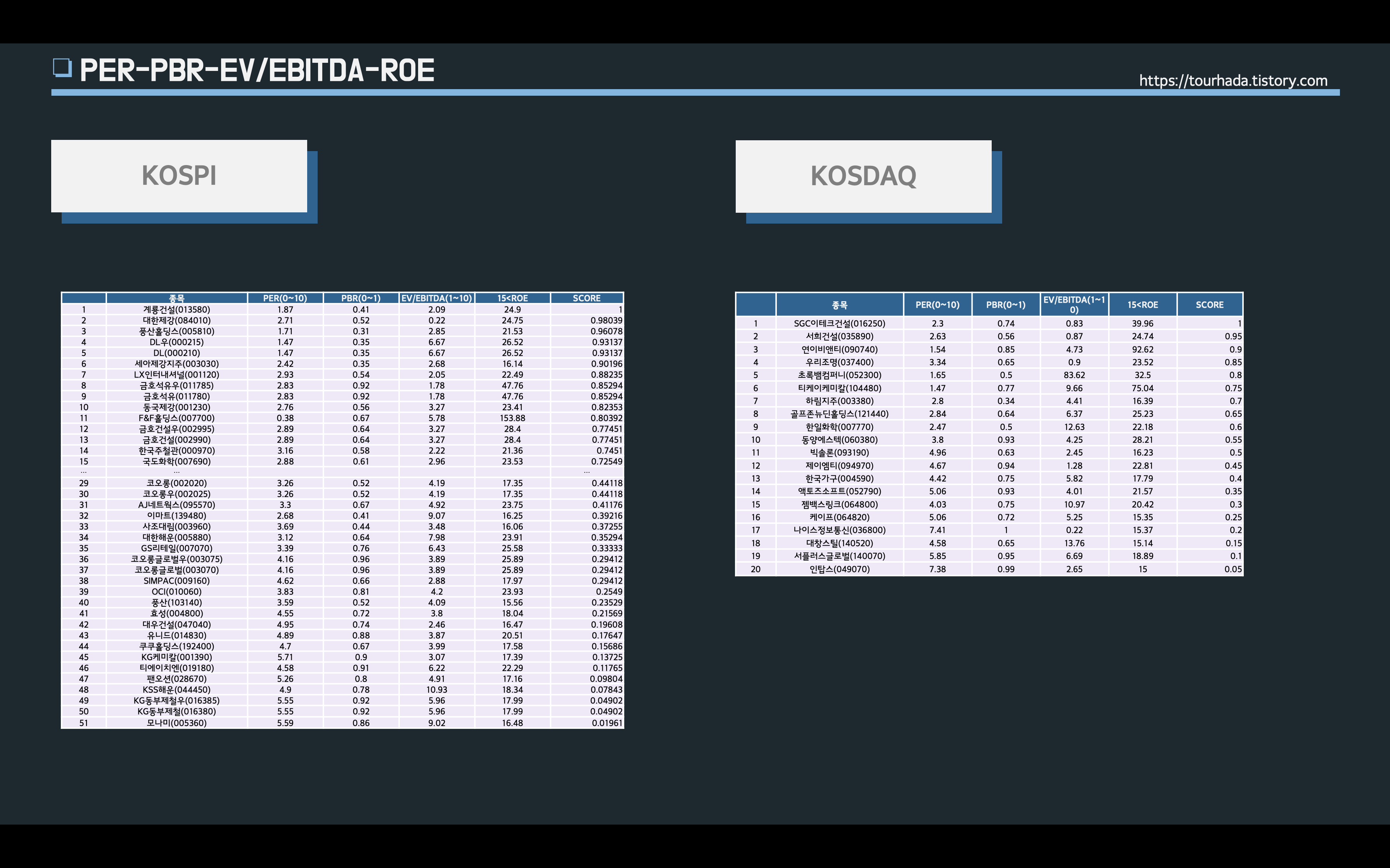 앞서 분석한 ROE 지표가 높은것에서 낮은 순으로 재 정렬해 보았을 때는 코스피(KOSPI) 종목에서 세아제강지수, 풍산홀딩스, GS, GS우, 현대비앤지스틸 순으로 나왔고, 코스닥(KOSDAQ)은 하림지주, 서희건설, 빅솔론, 우리조명, SGC이테크건설 등 순으로 나왔다.