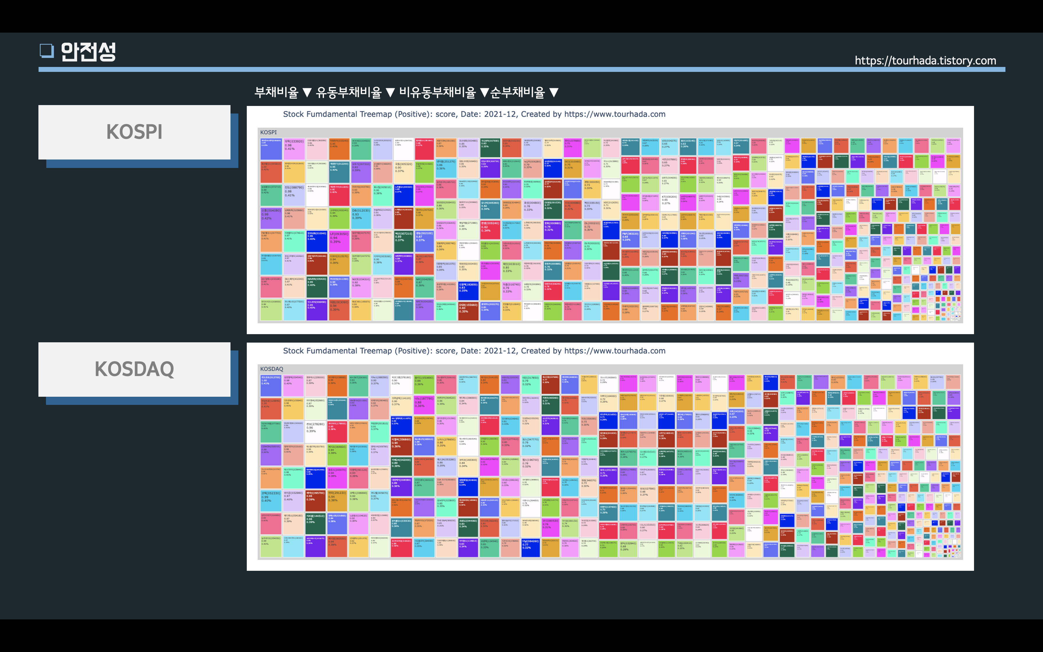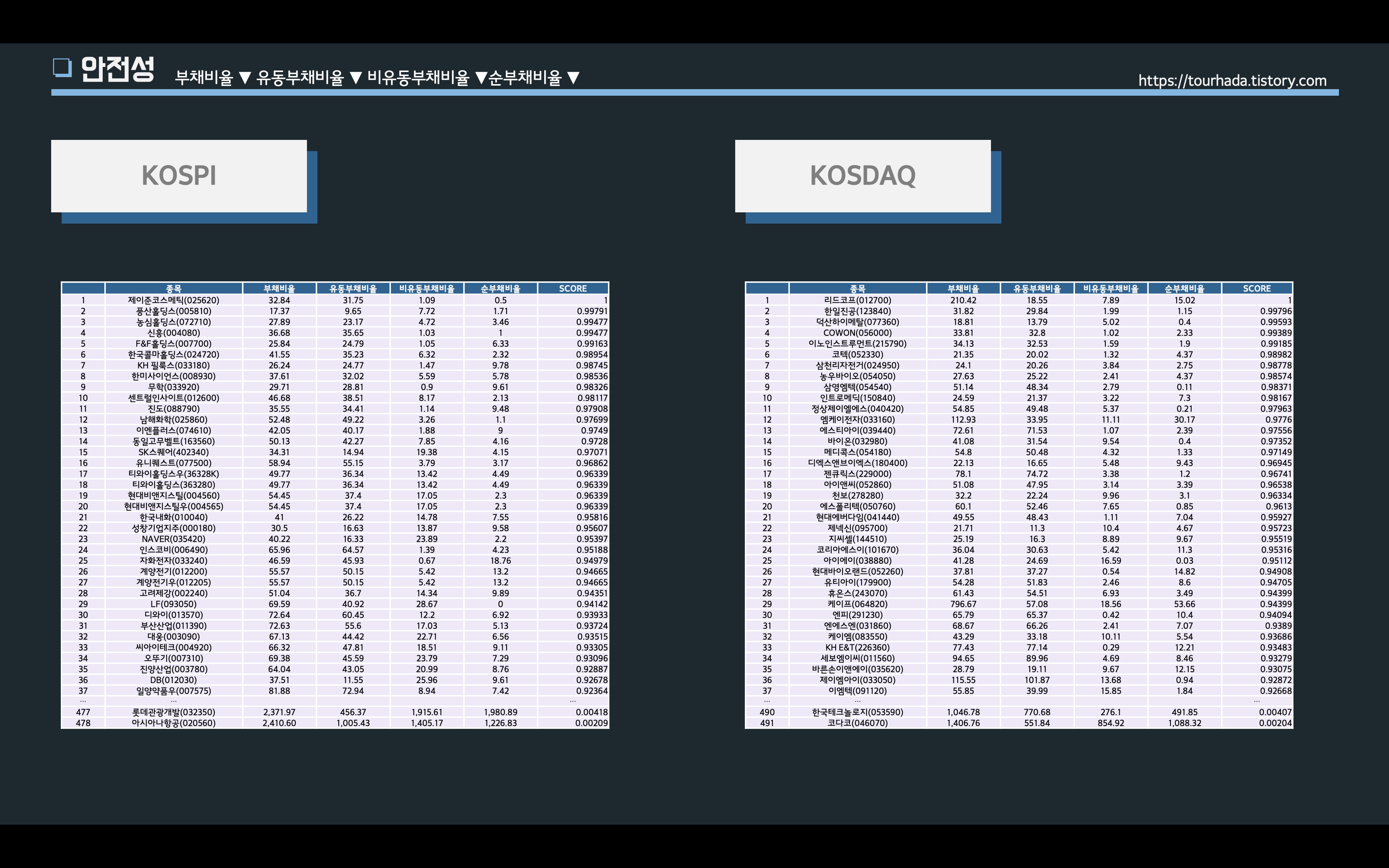 이와 관련된, 지표들 중에 부채비율, 유동부채비율, 비유동부채비율, 순부채비율 네가지를 데이터 모델링으로 최고값과 최소값의 평균가중치로 백분위로 나눠서 서열을 재정리 해보았다.