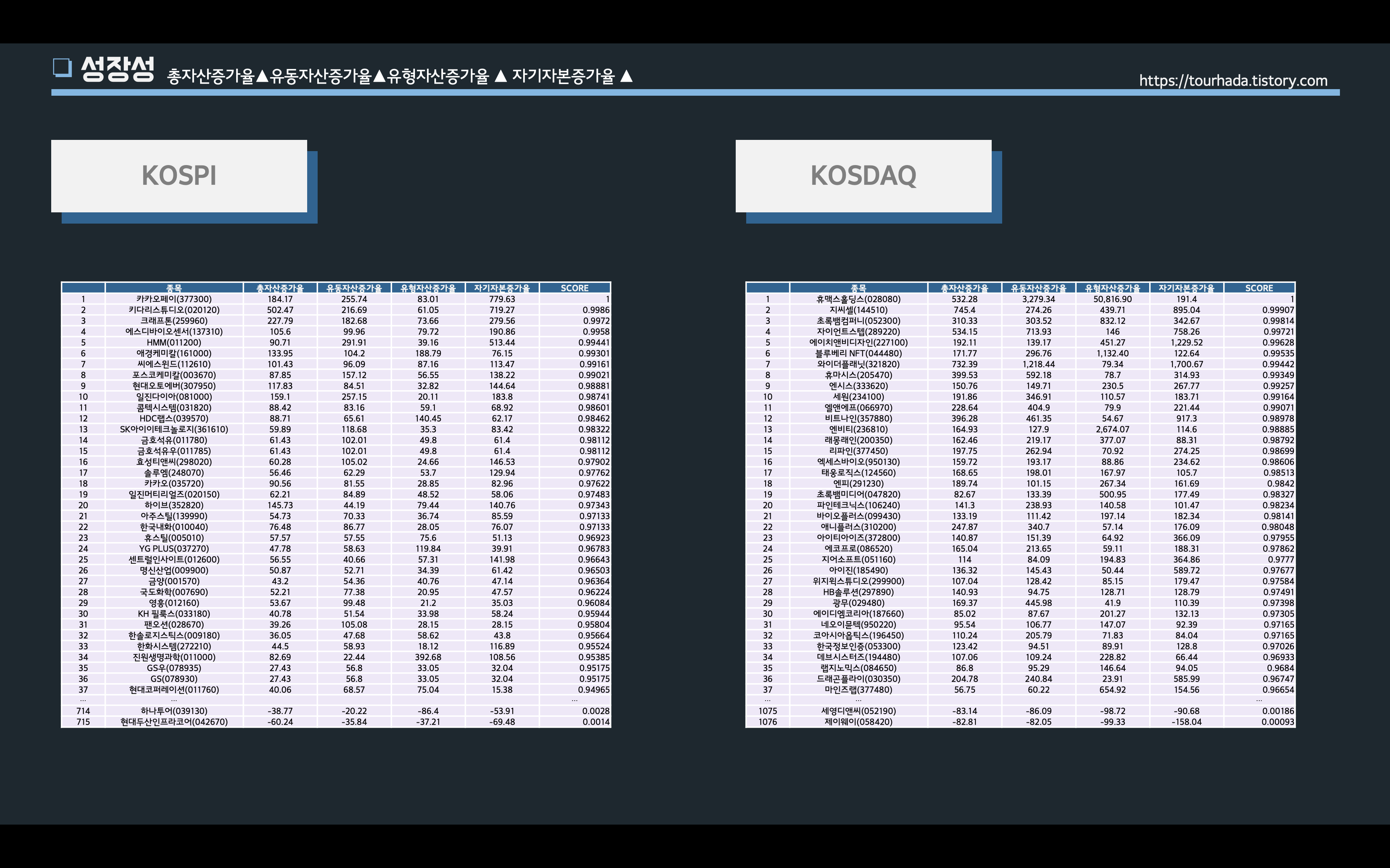 또다른 성장성 지표들 중에 총자산증가율, 유동자산증가율, 유형자산증가율, 자기자본증가율 네가지를 데이터 모델링으로 최고값과 최소값의 평균가중치로 백분위로 나눠서 서열을 재정리 해보았다.