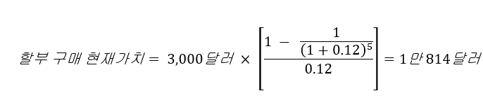 두번째 방법, 할부로 5년간 연말마다 3,000달러를 지급(할인율 12%)