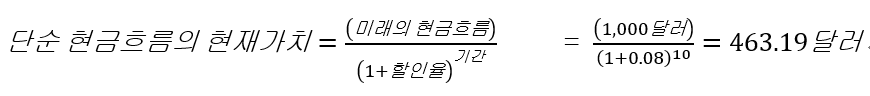 - 현재가치(present value): 미래 한 시점의 1달러가 오늘 시점에 어느 정도 가치인지 계산