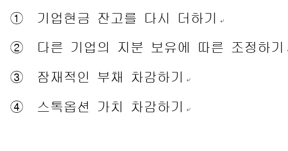 ▶ 분석순서: 기업가치 → 주주가치(기업가치 + 현금 + 상호지분 – 부채)