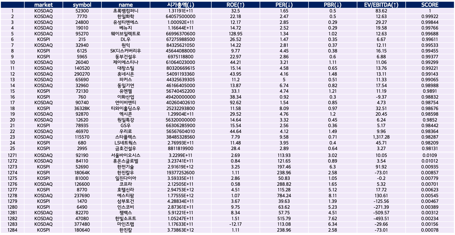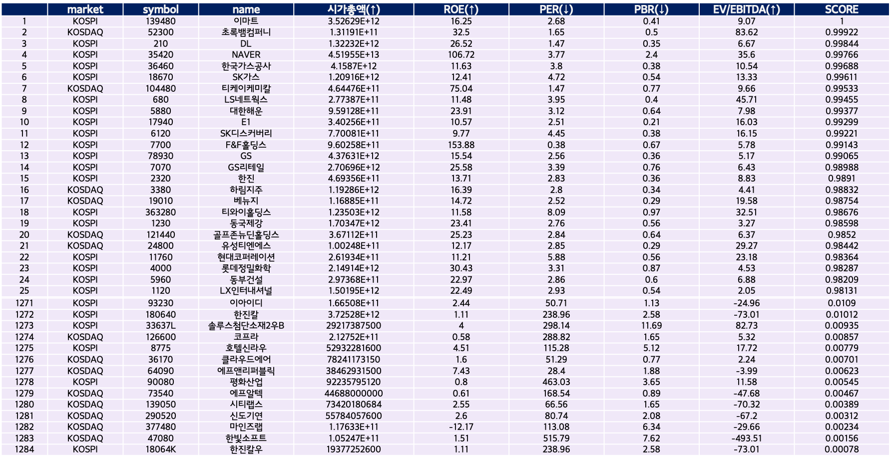 - RPPE 는 높은 ROE(↑), 낮은 PER(↓), 낮은 PBR(↓), 높은 EV/EBITDA(↑) 기준으로 분석을 해 보았다.