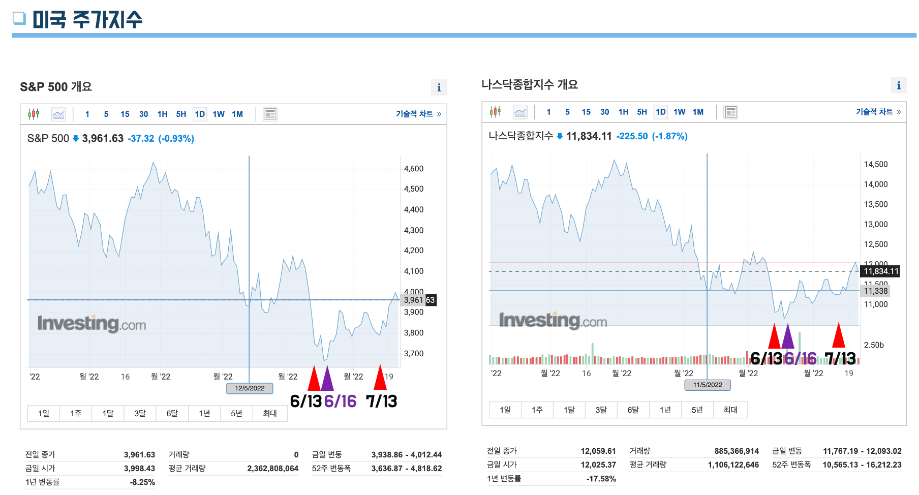 특이한 사항은 미국 소비자물가지수가 발표된 시점은 5월 11일과 6월 10일, 7월 13일에 걸쳐서 매월 이루어 졌는데, 공포심리는 선후반영되었던 것인지 VIX지수는 5월 9일과 6월 13일과 16일에 피크를 뛰었습니다. 그리고, 7월 발표 시점은 그리 높게 나타나지 않았지만 주가지수 변동성을 보면 소비자물가지수 발표 시점에 바로 반영해서 주가가 큰폭으로 하락한 것을 볼 수 있습니다.