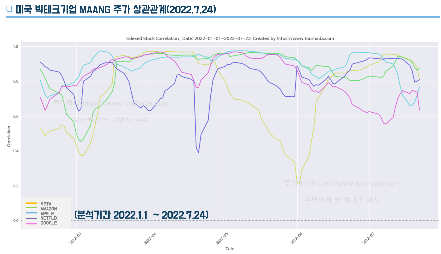 지난 대략 5년간 미국 빅테크 기업 5개 종목으로 나눠서 상관관계를 분석해 보았습니다. 앞에서 MAANG 관련 기업들의 S&P500지수와의 상관관계를 살펴 보고, 2022년 1월 부터 7월 24일 현재까지 좀더 자세히 살펴보았습니다. 빅테크 기업으로서 대부분 양의 상관관계를 보였지만, 기업실적이 나빠져서 주가 하락이 이루어진 메타와 네플릭스는 역시 상관관계도 낮아지면서 일부 기간에 따라 음의 상관관계를 보이기도 했습니다. 최근 테슬라와 마이크로소프트 기업실적이 높아지면서 새롭게 빅테크 기업으로 떠오르면서 MAGAT 으로 급부상하는 5개 IT 기업들의 상관관계를 보았습니다. 이들은 역시나 앞서 발생한 이슈와 반대 이유로 실적이 급등한 테슬라의 주가 상관관계만 조금 낮게 나오고 대부분 비슷한 양의 상관관계를 보이고 있습니다.