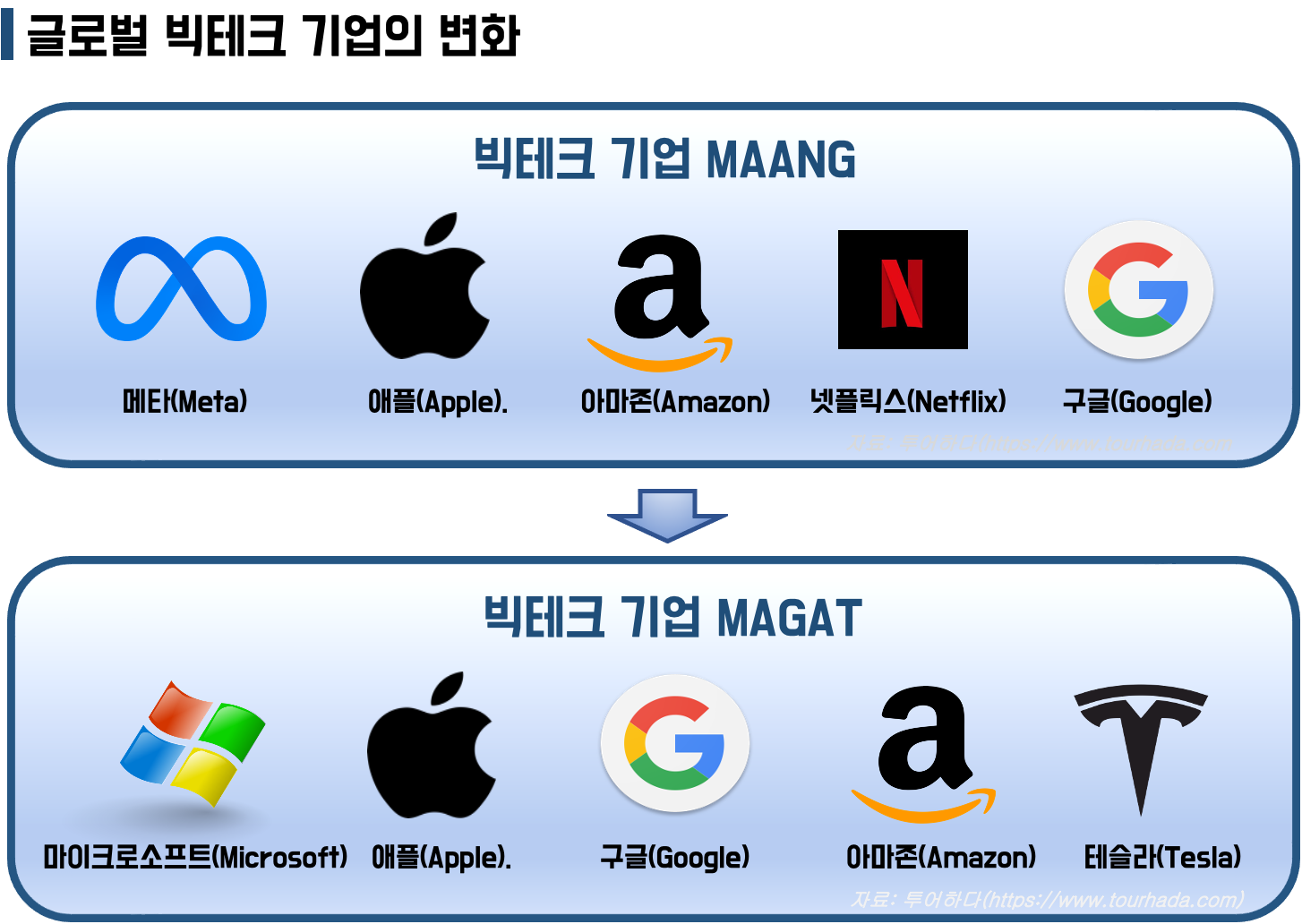 미국 주식거래 상장 기업 시가총액 상위 5위안에 든 기업이 모두 빅테크 기업으로서 MAGAT 입니다. 시가총액 기준으로만 단순 비교 하더락도 주식시장을 이끄는 기업이 한눈에 보이는데, 모두 빅테크 산업이 차지하는 것을 보면 우리가 이와 관련 산업섹터를 좀 더 살펴봐야 하는 이유가 되겠지요~