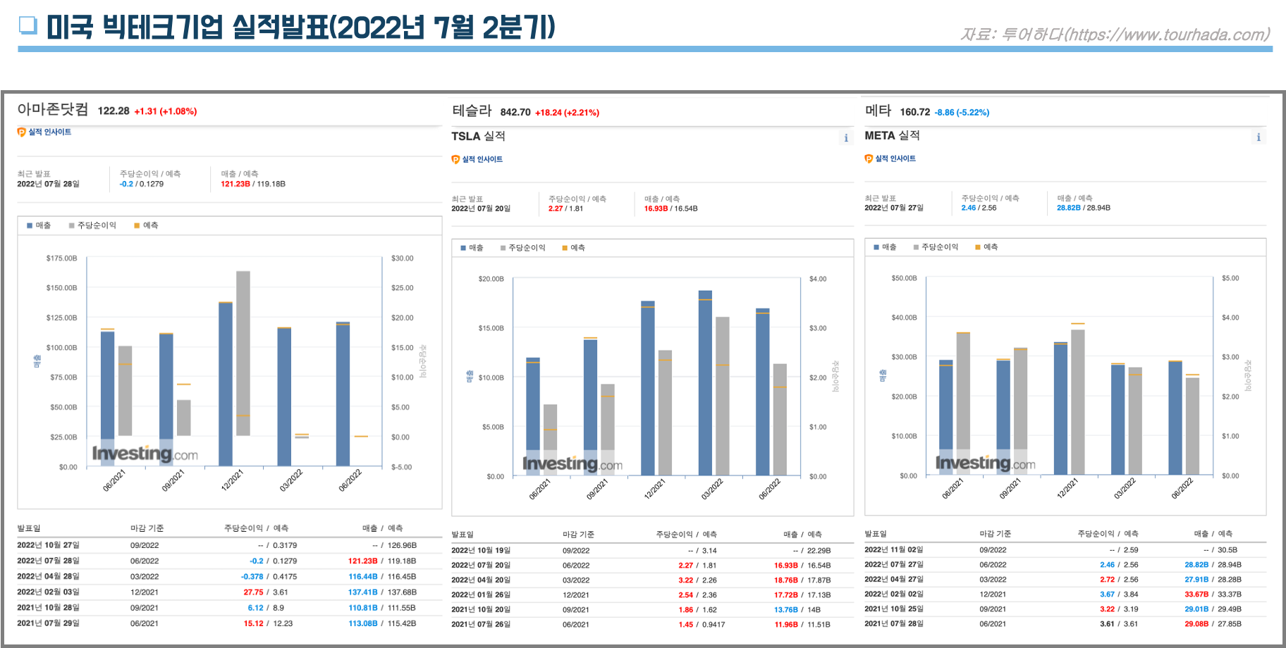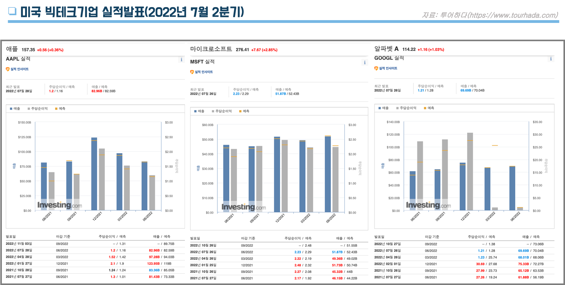 빅테크 기업들 중에 애플은 지난 2022년 1분기 대비 2분기는 실적 예상치가 줄어드는 것으로 보았으나, 매출과 주당순이익은 2분기 예측보다는 높게 나왔습니다. 마이크로소프트는 지난 1분기 대비 2분기는 실적 예상치가 늘것으로 보았으나, 실제 발표는 매출과 주당순이익이 1분기보다는 높아졌지만, 2분기 예측보다는 낮았습니다. 구글 알파벳A은 지난 1분기 대비 2분기 매출 실적 예상치가 늘것으로 보았지만, 실제 발표는 지난 1분기보다는 매출은 늘었지만 2분기 예측보다는 낮았고, 주당순이익은 지난 1분기 대비 낮게 예상했고 실제로 2분기 예측보다도 낮게 나왔습니다.