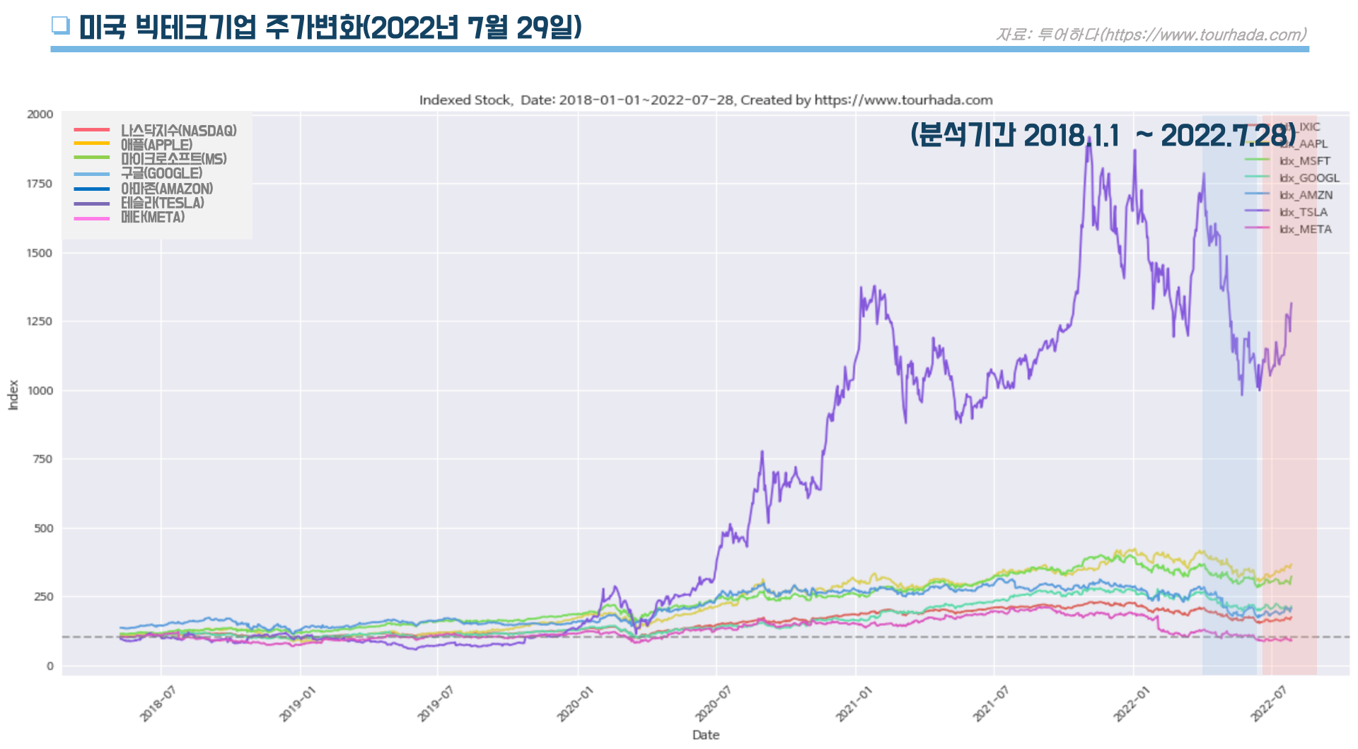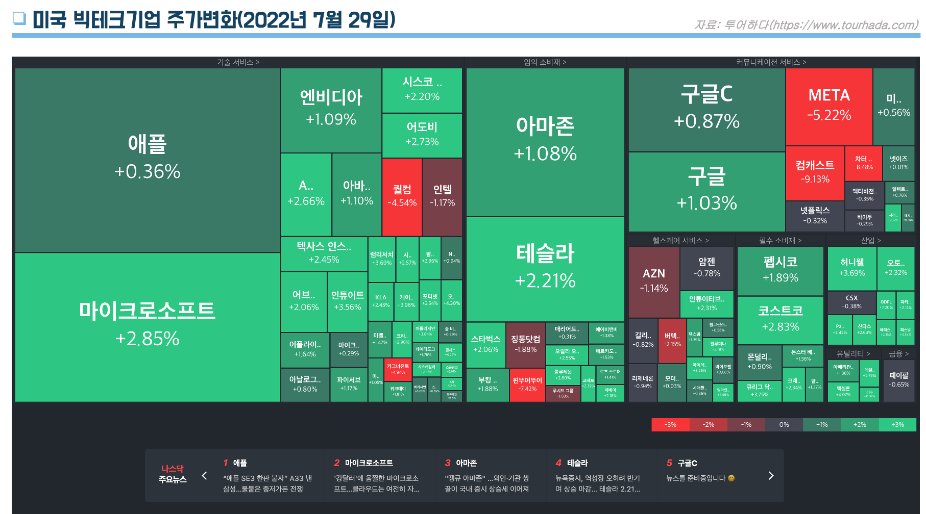 대부분 빅테크 기업들은 매출과 주당순이익등이 예상치보다 하락발표 된 가운데 같은 기간 나스닥과 마이크로소프트 7월 27일까지 장외 하락 마감했습니다만(자료: 연합뉴스, 네이버 뉴스), 오늘 29일(한국시간 기준)은 빅테크 기업 주가들이 모두 상승 마감하면서 나스닥도 함께 주가 상승을 이끌었습니다(자료: 토스). 이는 지난 7월 27일 기준금리 자인언트스텝 0.75% 올라 현재 기준금리는 2.50%로 이에대한 불안심리로 주가 하락했다가 시장에서는 심리적 안도감에 대한 반등이 일어난 것으로 보고 있습니다. 앞으로도 이와 같이 빅테크 기업들의 주가가 계속 오를지 일시적인 반등인지는 좀 더 지켜봐야 겠습니다.