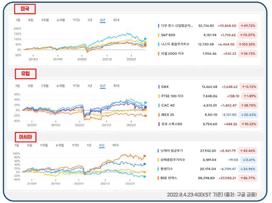 - 미국: 다우존스 산업평균지수, S&P500, 나스닥 종합주가지수, 러셀 2000 지수