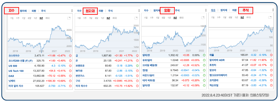 - 원자재: 금, 은, 브렌트유, WTI유, 천연가스, 구리, 니켈, 미국 옥수수 등