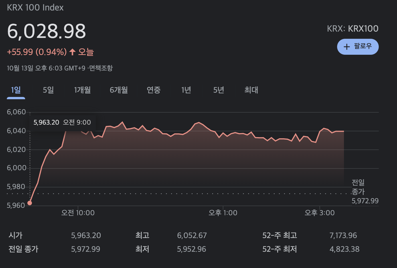 <그림 4-1> Korea Exchange KRX 100 지수 (2021년 10월 13일 기준)