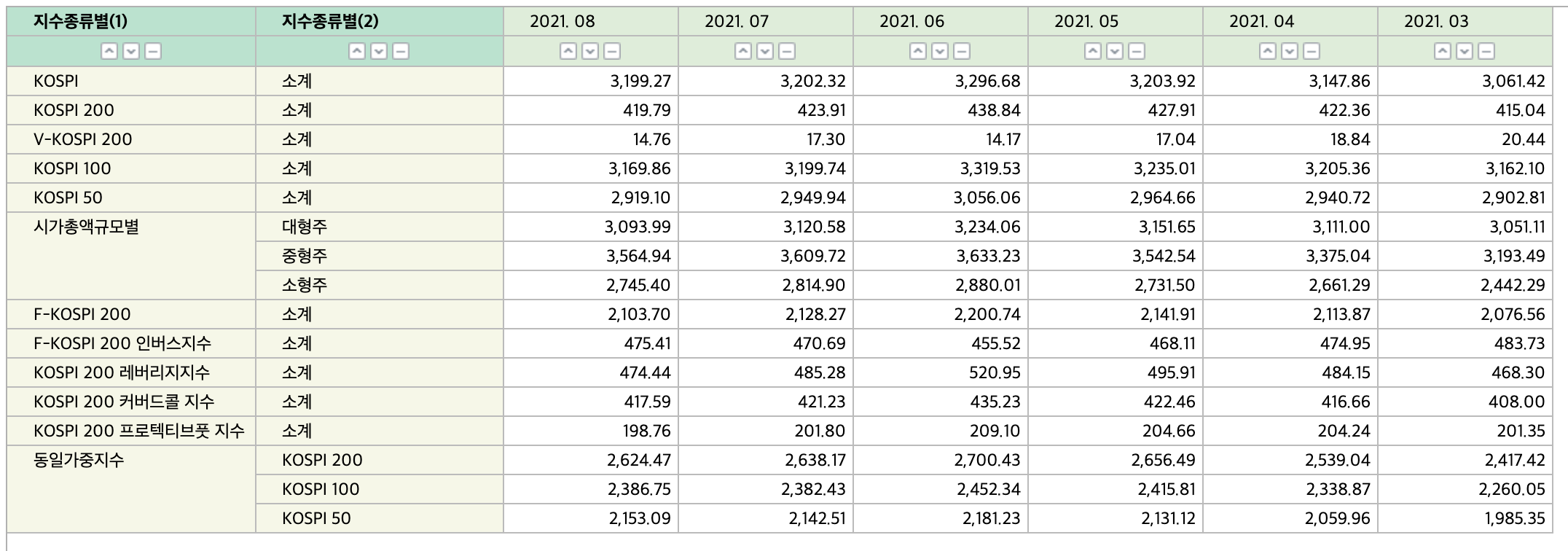 <그림 5-1> 한국 KRX 주요 지수 항목 (2021년 10월 13일 기준)