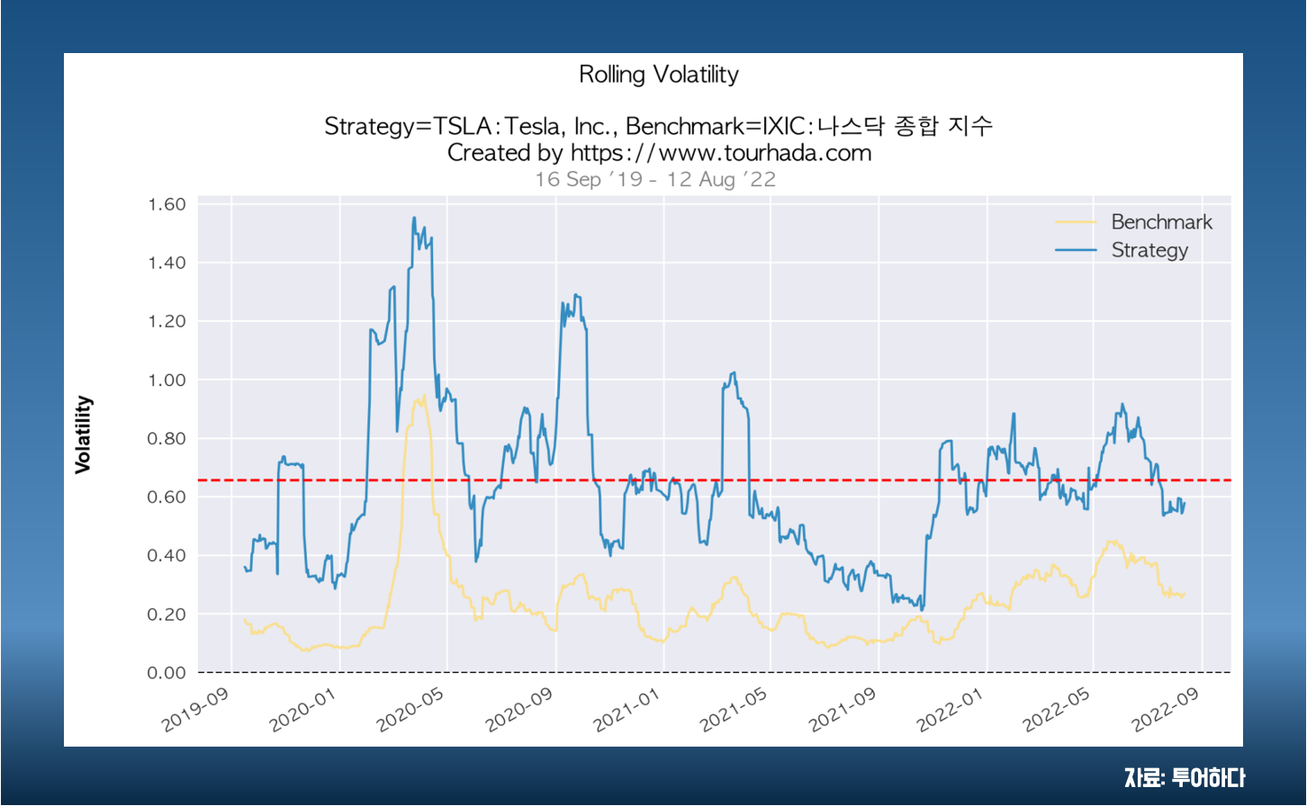 2020년 9월 ~ 2022년 9월: Tesla의 주가는 약 400% 상승하는 좋은 실적을 이어갔고, NASDAQ Composite(IXIC) 벤치마크 지수는 같은 기간 동안 약 60% 상승했습니다.