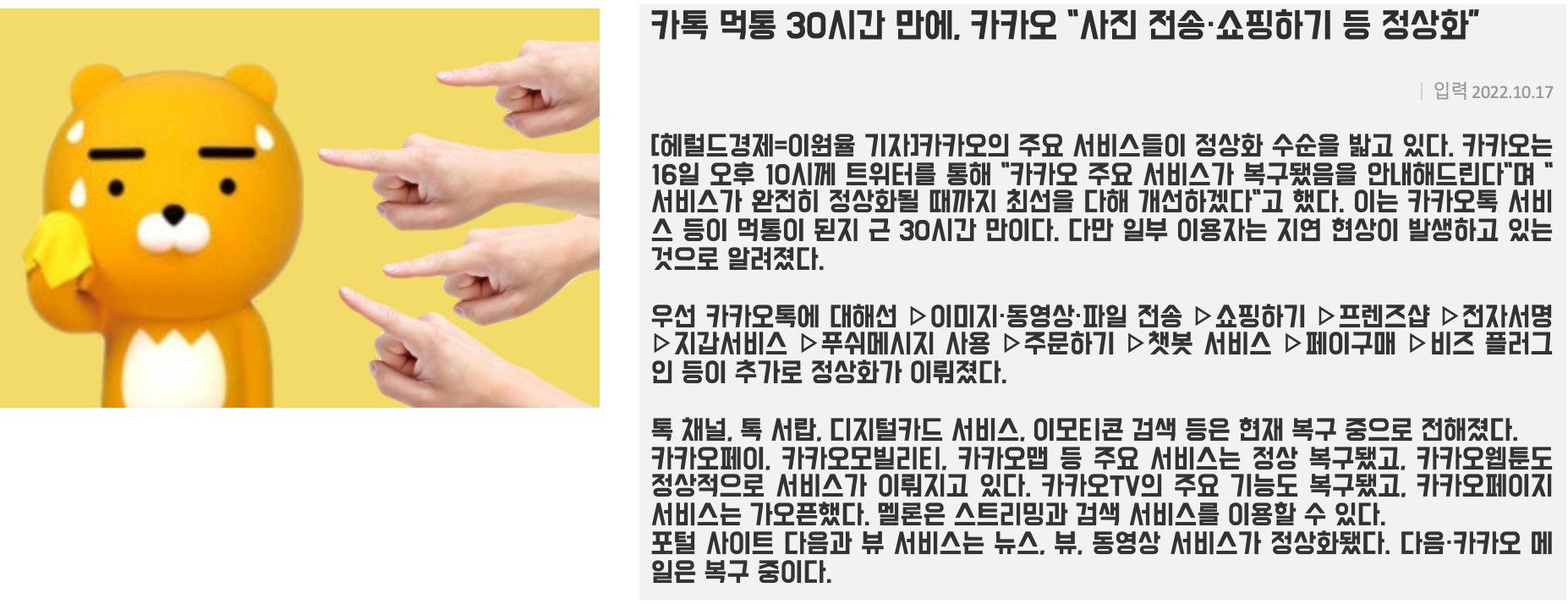카카오 데이터센터 화재로 카카오톡(카톡) 먹통 30시간이 지나서 채팅 등 주요 기능만 복구 되고, 사진 보내기등 일부 기능은 여전히 되지 않다가 이후 파일 전송 기능등이 이루어져 많은이들의 불편함을 느꼈습니다. 카카오 데이터 센터가 한곳에 집중된 탓에 카톡을 통한 인증기능이 모두 먹통이 되서 실상 다른 앱과 연동된 많은 곳들에서 마비되는 일이 발생 했습니다. 한예로, 따릉이나 전동스쿠터등 대여 서비스의 경우는 인증기능때문에 반납이 불가능해서 대여료만 십만원이 넘게 발생해 곤욕을 치뤄야 해서 이와 관련된 보상에 대한 논의가 차후에 이루어질 것으로 예상됩니다.