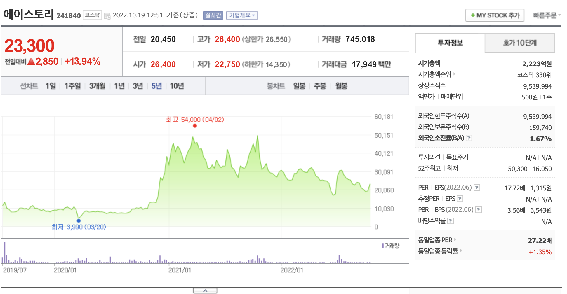 에이스토리와 넷플릭스 3년간 누적 수익률을 비교 했을때, 놀랍게도 에이스토리가 더 높게 나온것을 확인할 수 있었습니다. 이상한 변호사 우영우 드라마로 지난 7월에 주가가 급상승했던 때는 5월이후 하락했던 주가가 급상승 반전을 꾀했던것이고, 이미 2020년 말부터 이주가는 급상승을 맞이하면서 300%이상의 수익률이 나는 것을 확인할 수 있었습니다.