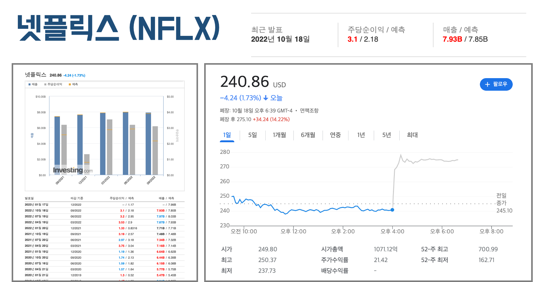 넷플릭스(Netflix)가 한국시간 10월 19일 장마감후 실적발표가 되면서, 장마감 240.86$(-1.7%)하락마감후 애프터마켓 주가가 14.1%로 한국 원하로 주가 343,370원에서 48,527원(10월 19일 한국시간 환율기준) 급상승 마감했습니다.