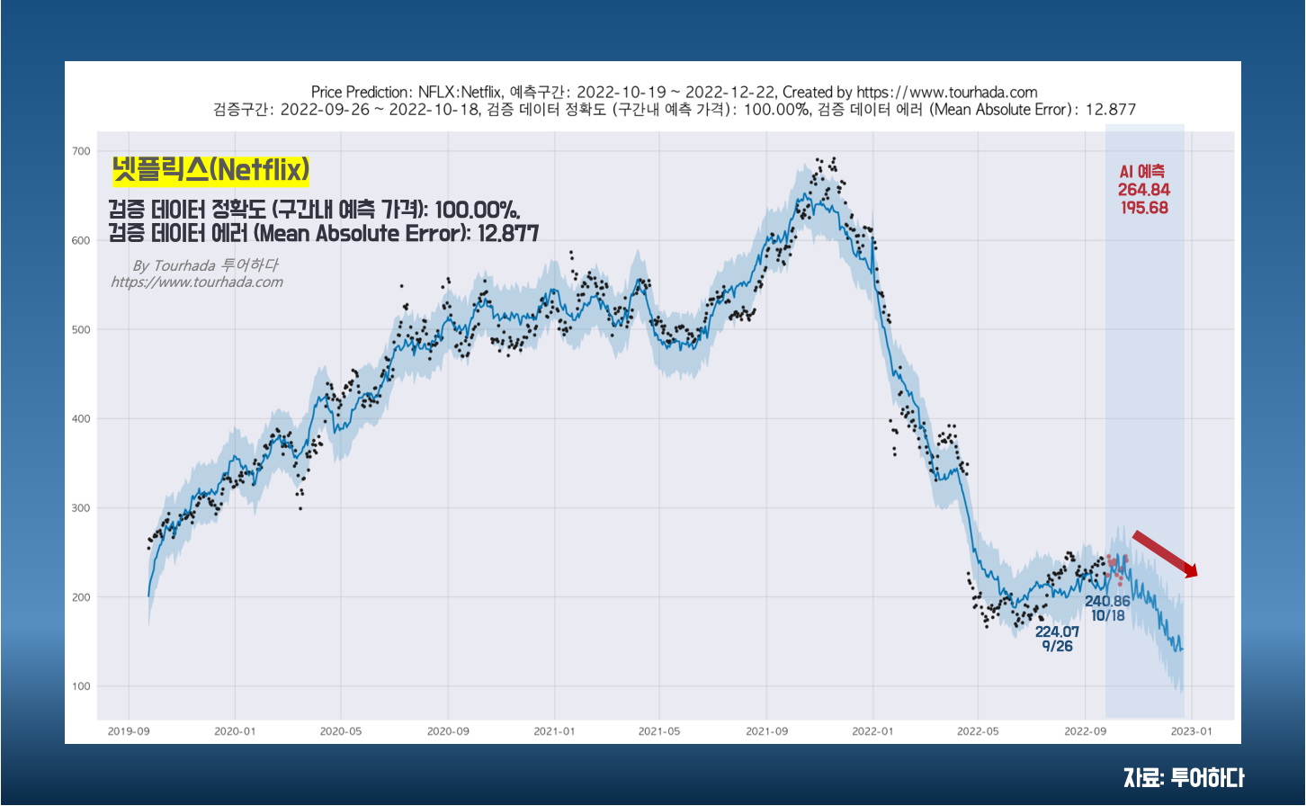 AI 알고리즘을 통해서 넷플릭스 데이타 정보로 미래 예측 가격을 측정해보았습니다. 이번에 실적발표가 좋게 나온 날은 데이터가 반영되지 않아서 예측된 가격은 주가가 하방 흐름을 보일 것이라고 분석결과를 보였습니다. 그러나, 이번 실적발표를 계기로 몇일간 넷플릭스가 상승 주가를 지속이어간다면 미래 가격은 약간의 변동성이 있을 것으로 추측됩니다. 검증데이터 정확도는 100%이지만, 공개된 자료는 파라미터 변수를 정교하게 작업하지 않았기에 예측 변동구간이 상이하게 다를 수 있습니다.