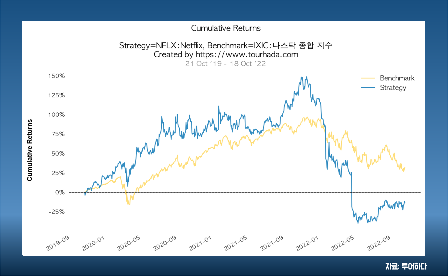 연도별로 수익률을 비교 했을때, 2022년 전에는 플러스였다가 마이너스로 수익률을 반납했습니다. 특히, 나스닥종합지수가 -30% 가까이 될때 넷플릭스는 -50% 이상 까지 났던 것으로 보입니다.