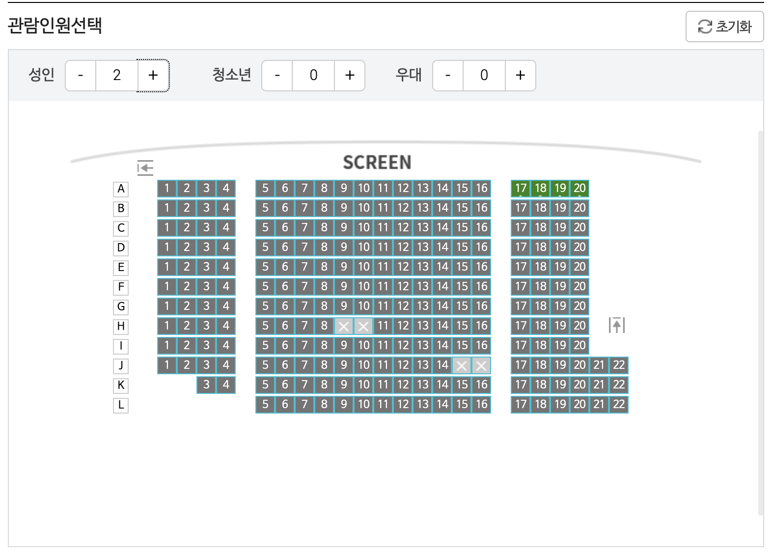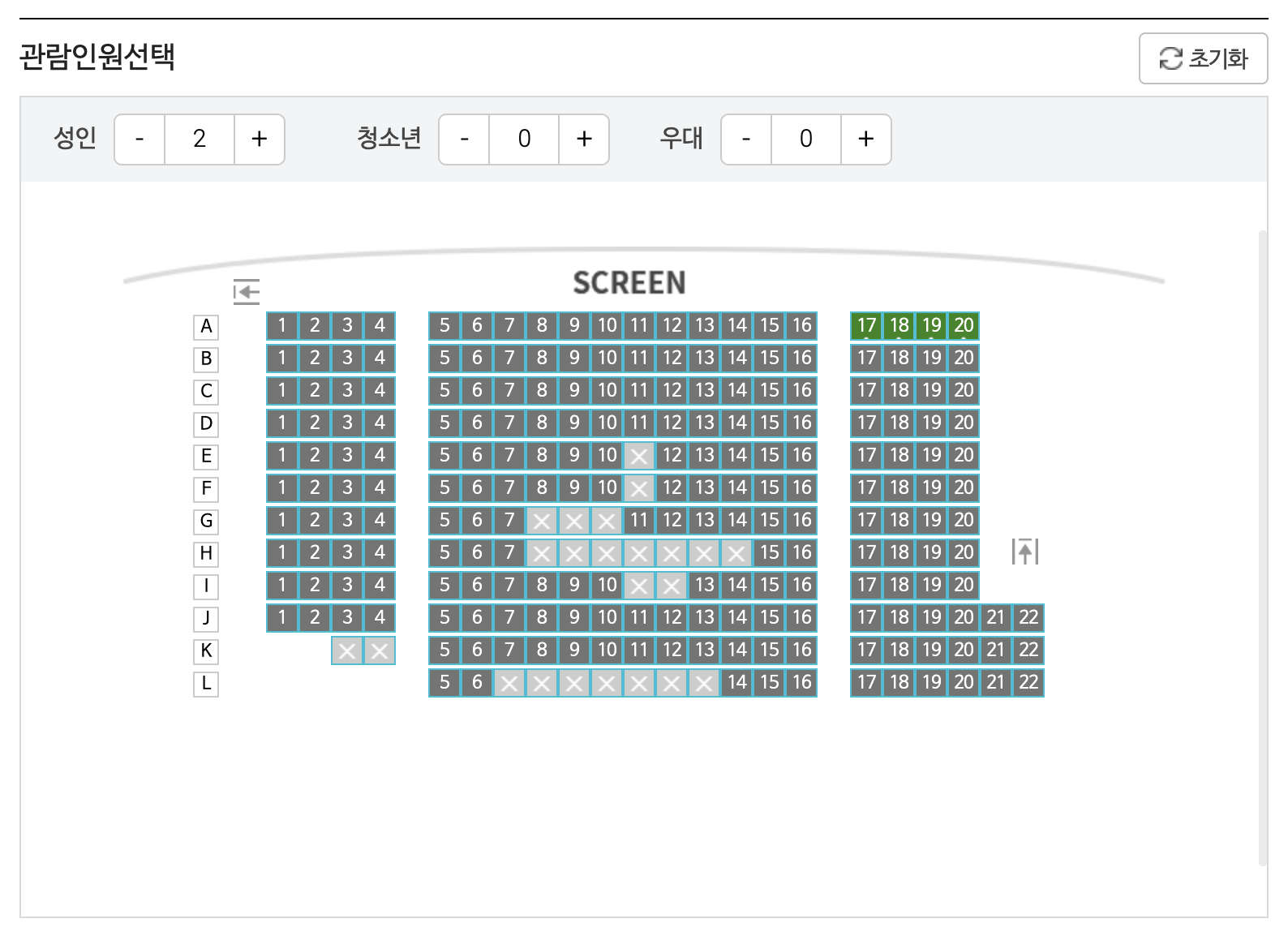 OOO 지점 E~J열 9~12 좌석이 좋다는 정보입수해서 예약완료~