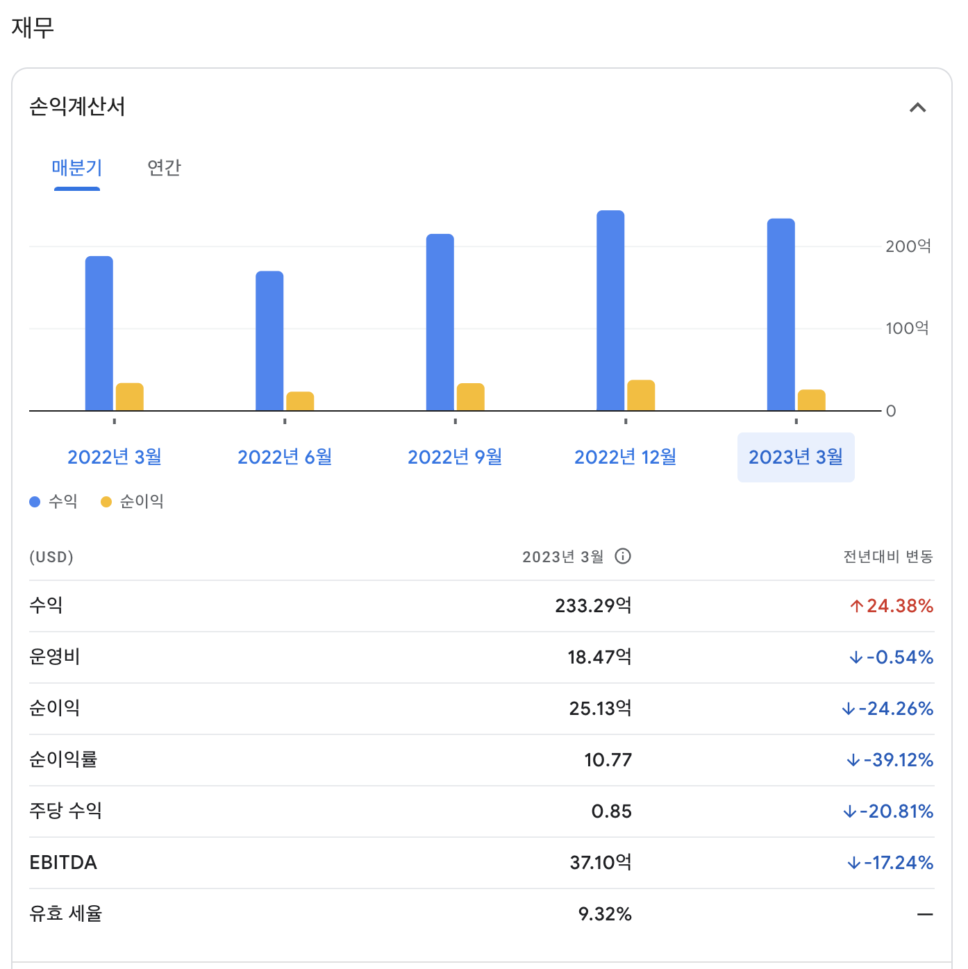 매출 24.93B(예측 24.29B) 주당순이익 0.91(예측 0.79)