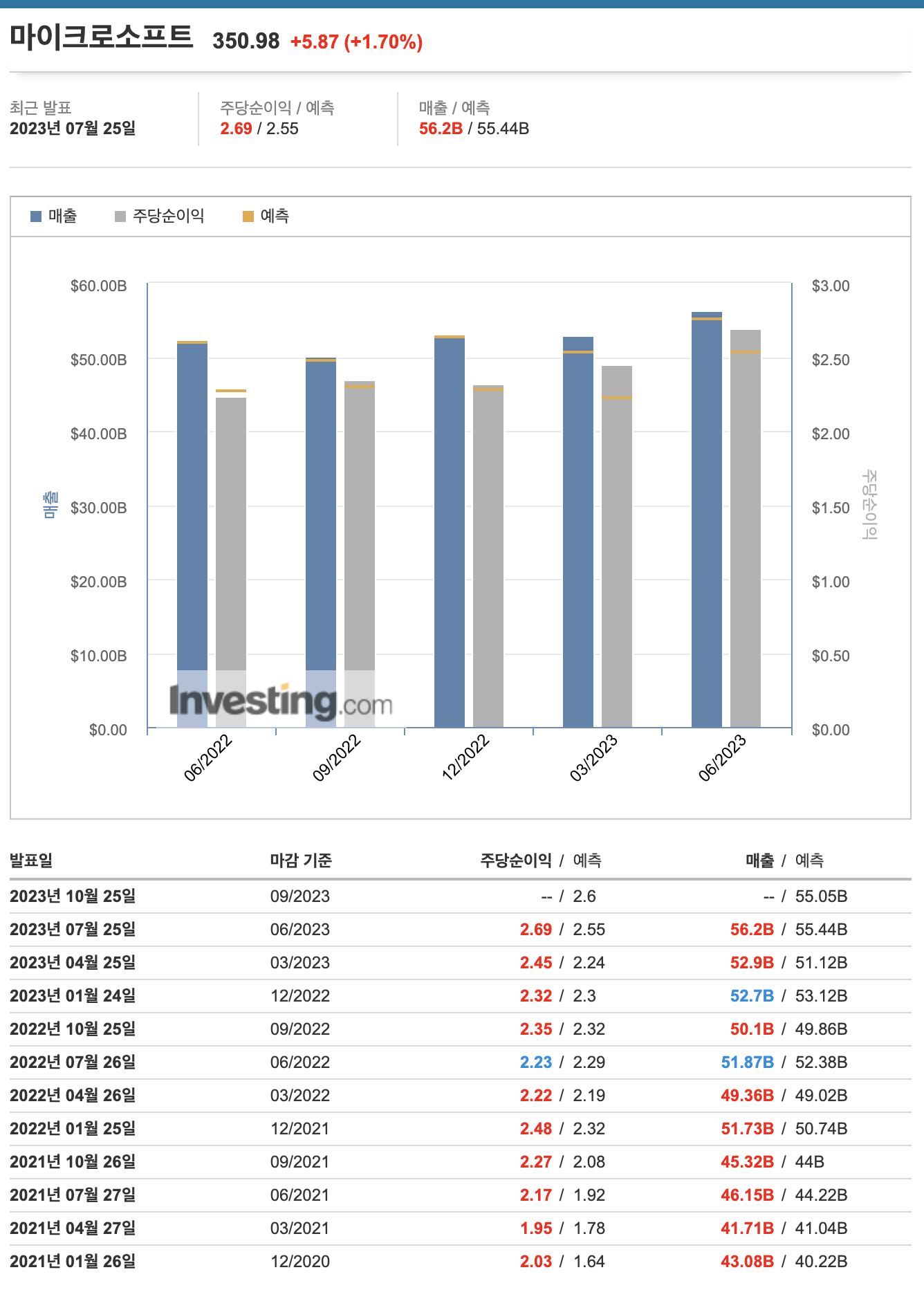 | 마이크로소프트 | 7월 25일 | 52.9B | 56.2B(55.41B) | 2.45 | 2.69(2.55) |