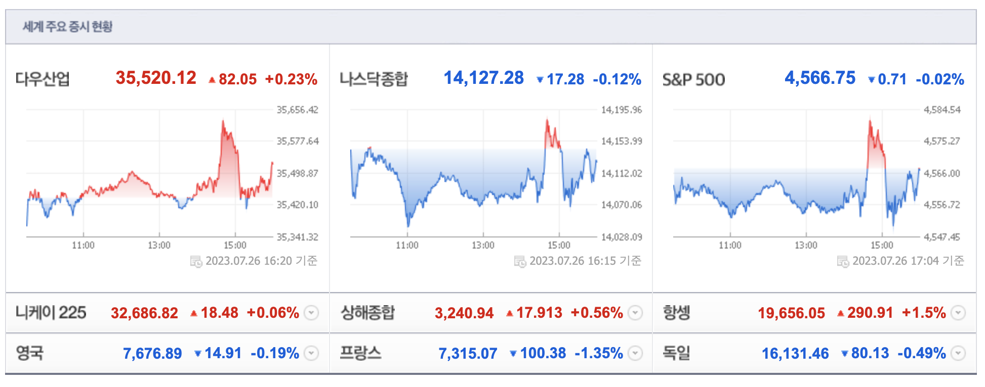 💠 뉴욕증시, 미국 금리 인상 속 혼조…다우 0.2%↑마감 [날짜: 20230727]