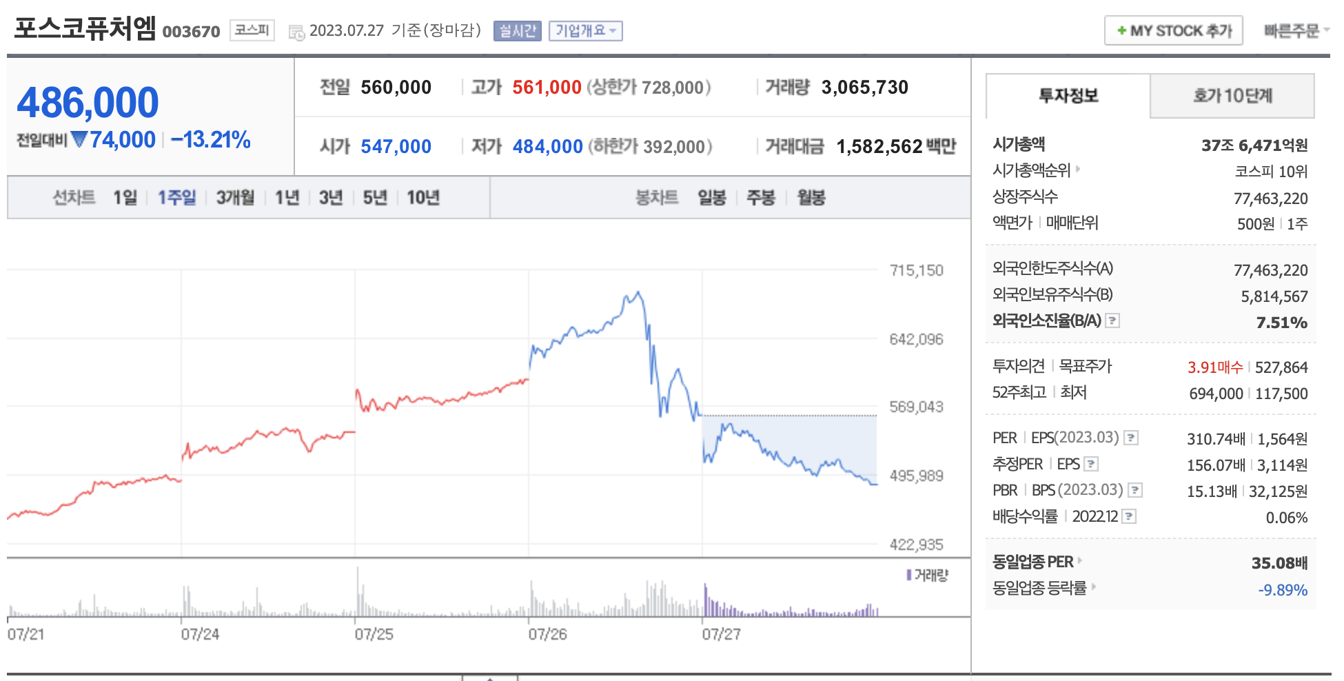2차 전지주 대장격이었던 코스닥 상장된 에코프로와 에코프로비엠, 코스피 상장된 포스코 그룹 계열사 포스코 홀딩스, 포스코퓨처엠, 포스코인터네셔널, 포스코스틸리온 기업들이 모두 일제히 같은 그래프의 주가 방향성을 보여주었는데요.