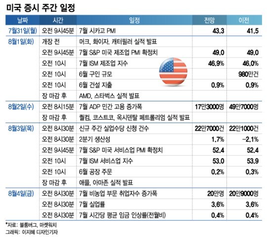 | 미국 7월 시카고 연방준비은행(연은) 구매관리자지수(PMI) 미국 7월 댈러스 연은 제조업지수 온 세미컨덕터 등 실적 발표 |