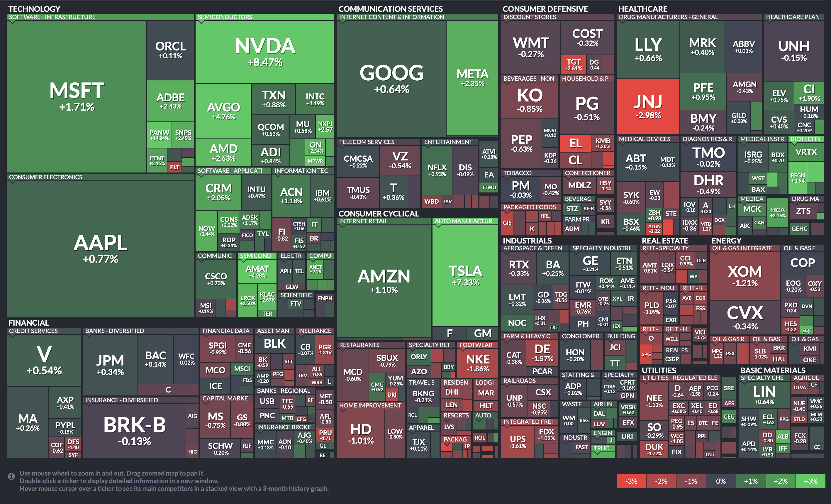 엔비디아 실적 기대감에 기술주가 상승했다. 엔비디아 8.47%, 애플 0.77%, 마이크로소프트 1.71%, AMD 2.63%, 인텔 1.19%, 아마존 1.10%, 알파벳 0.71%, 메타 2.35%, 넷플릭스 0.93% 상승 마감했다.