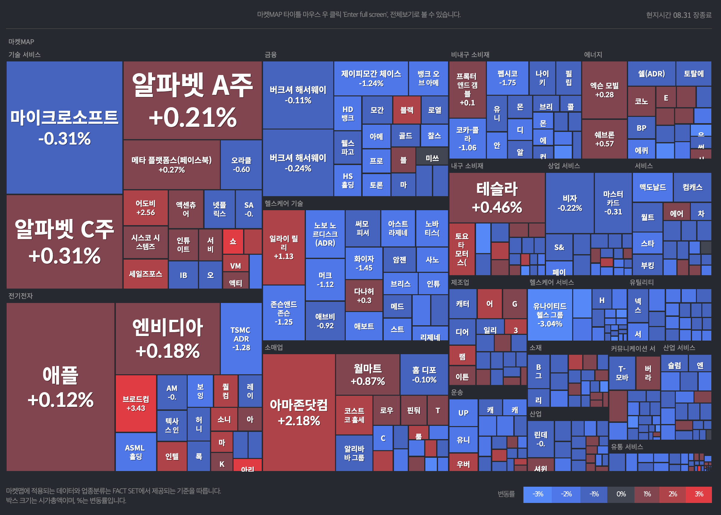 기술주가 상승했다. 애플 0.12%, 엔비디아 0.18%, 아마존 2.18%, 알파벳 0.21%, 메타 0.27% 올랐다. 반면 마이크로소프트는 0.31%, 넷플릭스 0.23% 하락 마감했다.