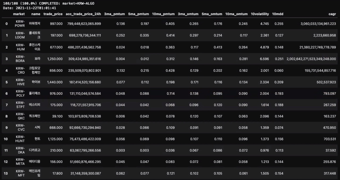 2021년 11월 22일 분석결과 14개의 종목이 추천되었다.