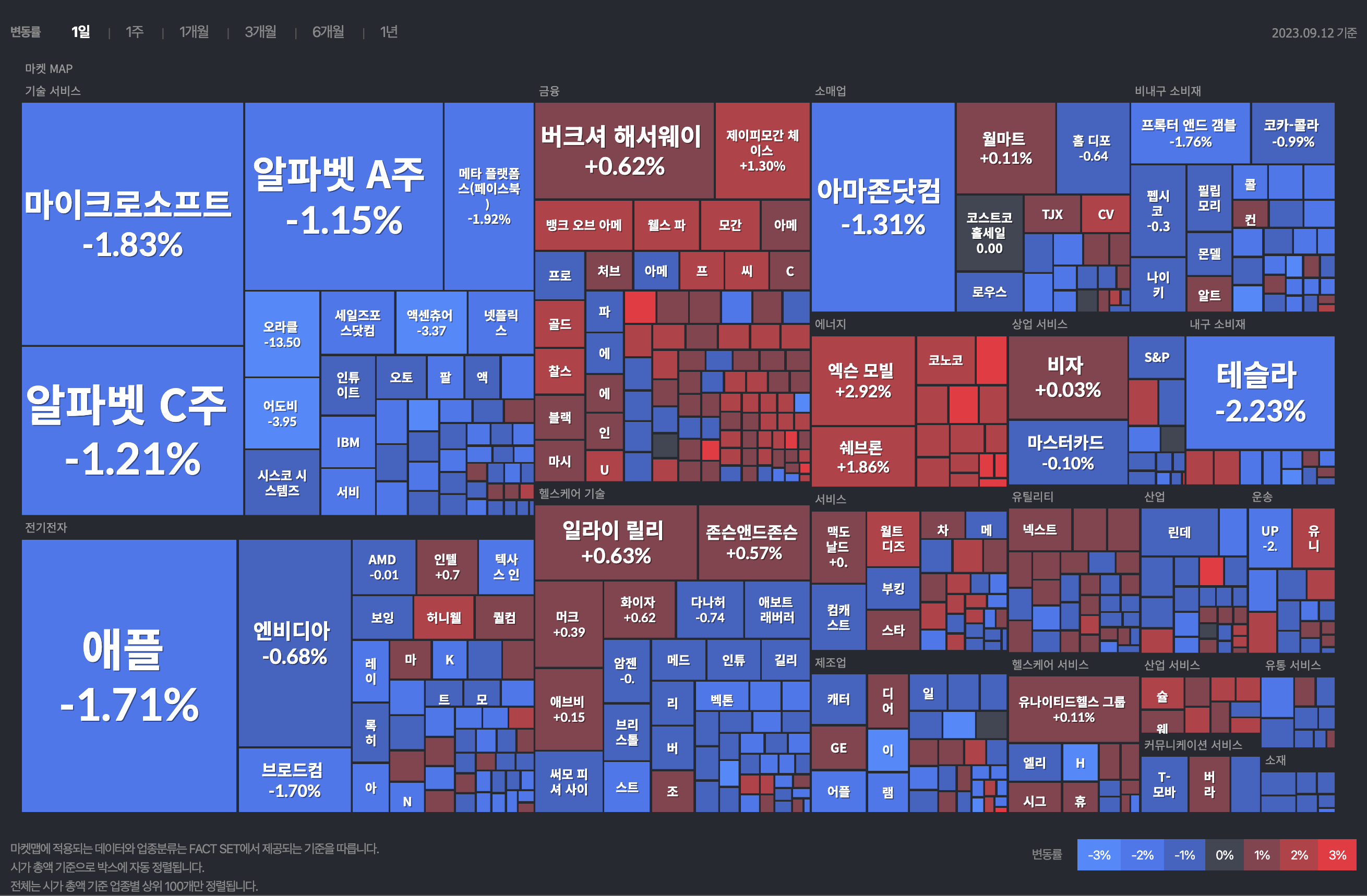 기술주가 하락했다. 애플이 신제품 공개에도 1.71%, 마이크로소프트 1.83%, 메타 1.92%, 알파벳 1.15%, 넷플릭스 2.4%, 엔비디아 0.68% 하락 마감했다.