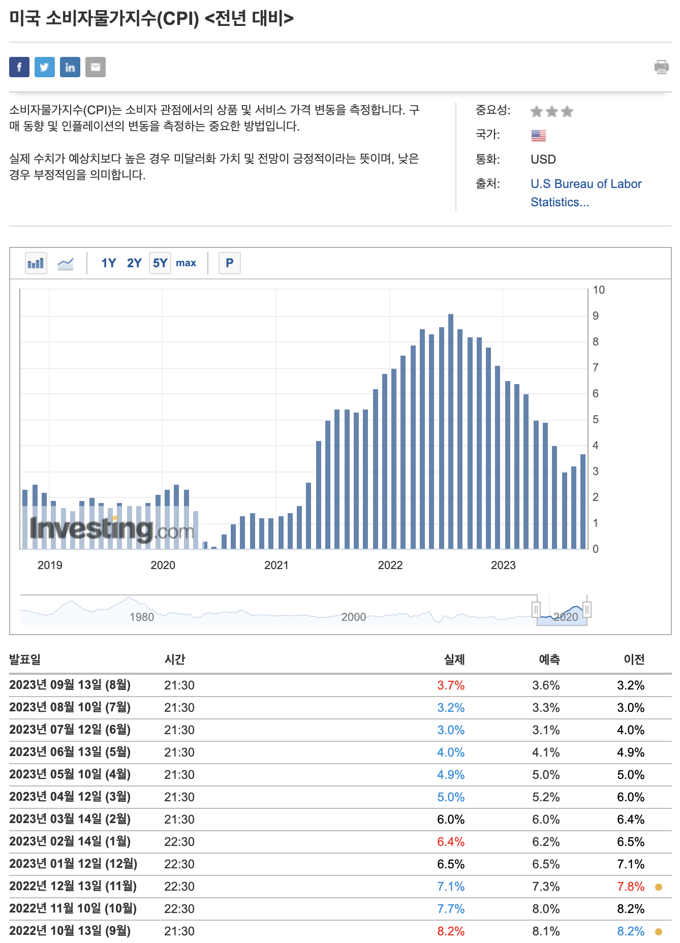 - 미국의 소비자물가지수(CPI)가 8월에 전년 동월보다 3.7% 상승